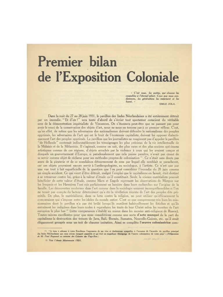 3 juillet 1931.Ce second tract réagit - de manière complexe - à l'incendie qui vient d'avoir lieu dans le Pavillon des Indes néerlandaises de l'Exposition coloniale. Ravis de voir tomber l'une des pièces capitales de cette « démonstration impérialiste », ils déplorent la perte des objets d'art primitif qu'il contenait, non seulement pour leur valeur propre, mais…Vendu