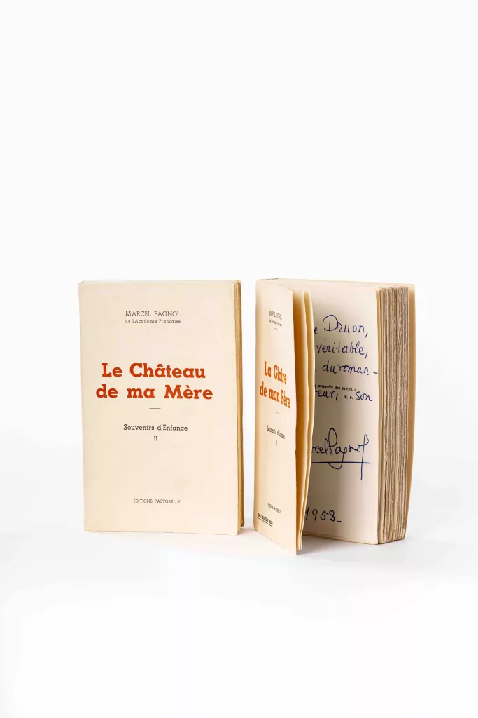 Monte Carlo, Pastorelly, (25 novembre) 1957 et (18 avril) 1958.Le chef-d'oeuvre romanesque de Pagnol, son « journal d'enfance », ici offert à Maurice Druon. Pagnol précéda ce dernier à l'Académie française, puisqu'il avait été immortalisé à quarante-sept ans seulement, le 4 avril 1946. Sa réception, le 27 mars 1947, par Jérôme Tharaud, est filmée, ce qui constituait une première dans l'histoire de l'Académie française.…Vendu
