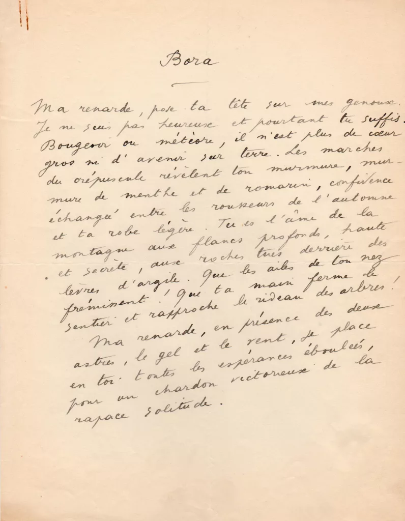 La revue Fontaine de Max-Pol Fouchet publie dans son n° 50 de mars 1946 les fragments 222, 219, 213, 214, 218 et 221 du futur recueil Feuillets d'Hypnos. Ils portent tous alors un titre indépendant : « Bora », « Le vitrail de Valensole », « La murmurée », « La révélée », « La…Vendu