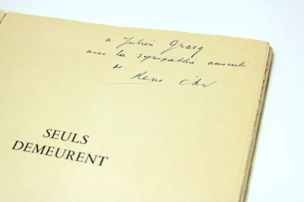 Paris, Gallimard, 1945.Le premier des ouvrages de Char envoyé à Julien Gracq, en réponse à l'envoi du Beau ténébreux, paru presque le même jour de février 1945 et envoyé au poète par le romancier.Il n'existe que peu d'échanges entre les deux hommes : six lettres de Char à Gracq, détenus par la Bibliothèque Doucet (Ms 5101643, préemption…Vendu