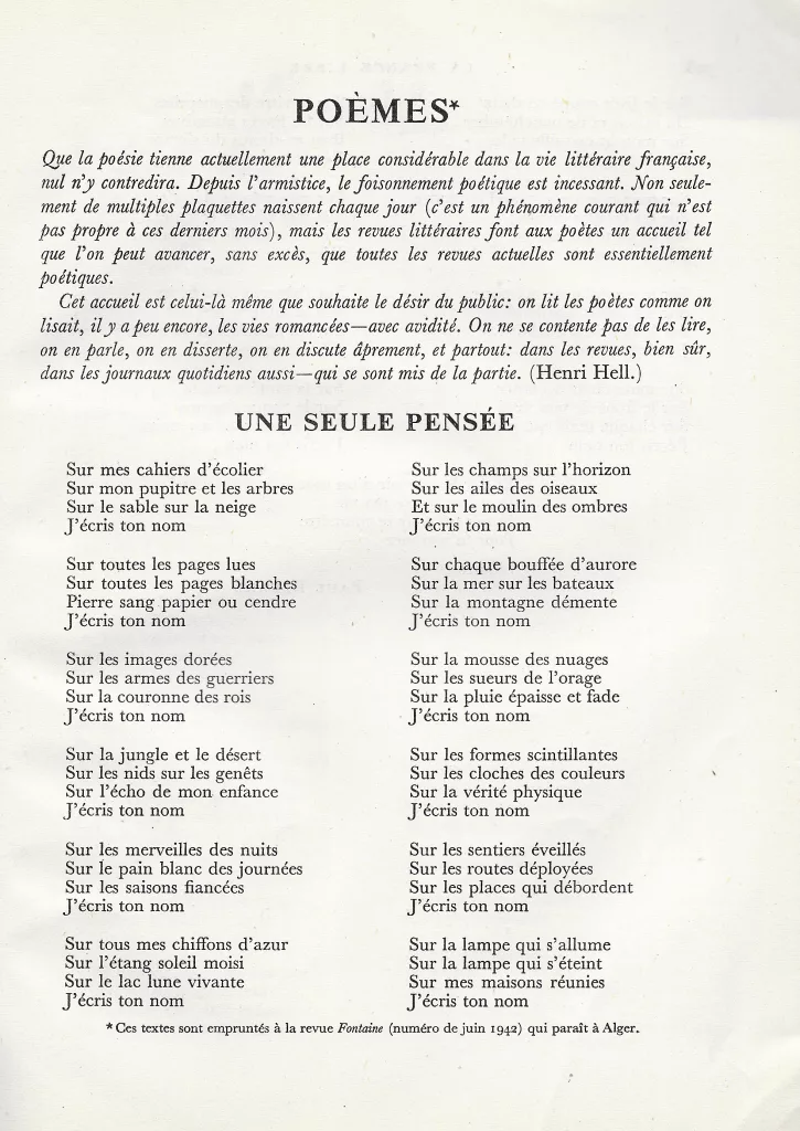 Rio de Janeiro, Atlantica Editora, (14 juillet) 1944.Poèmes de Pierre Jean Jouve, Jacques d'Aymé, Loys Masson. Pierre Emmanuel, Jean Wahl, Louis Aragon, Daniel Thérésin, Jacques Destaing et Paul Éluard : « Bientôt », « La halte des heures » et « Liberté » (p. 53-55), avec les deux mots désir et souvenir des 19e et 20e strophes au singulier, mais sous le…Vendu