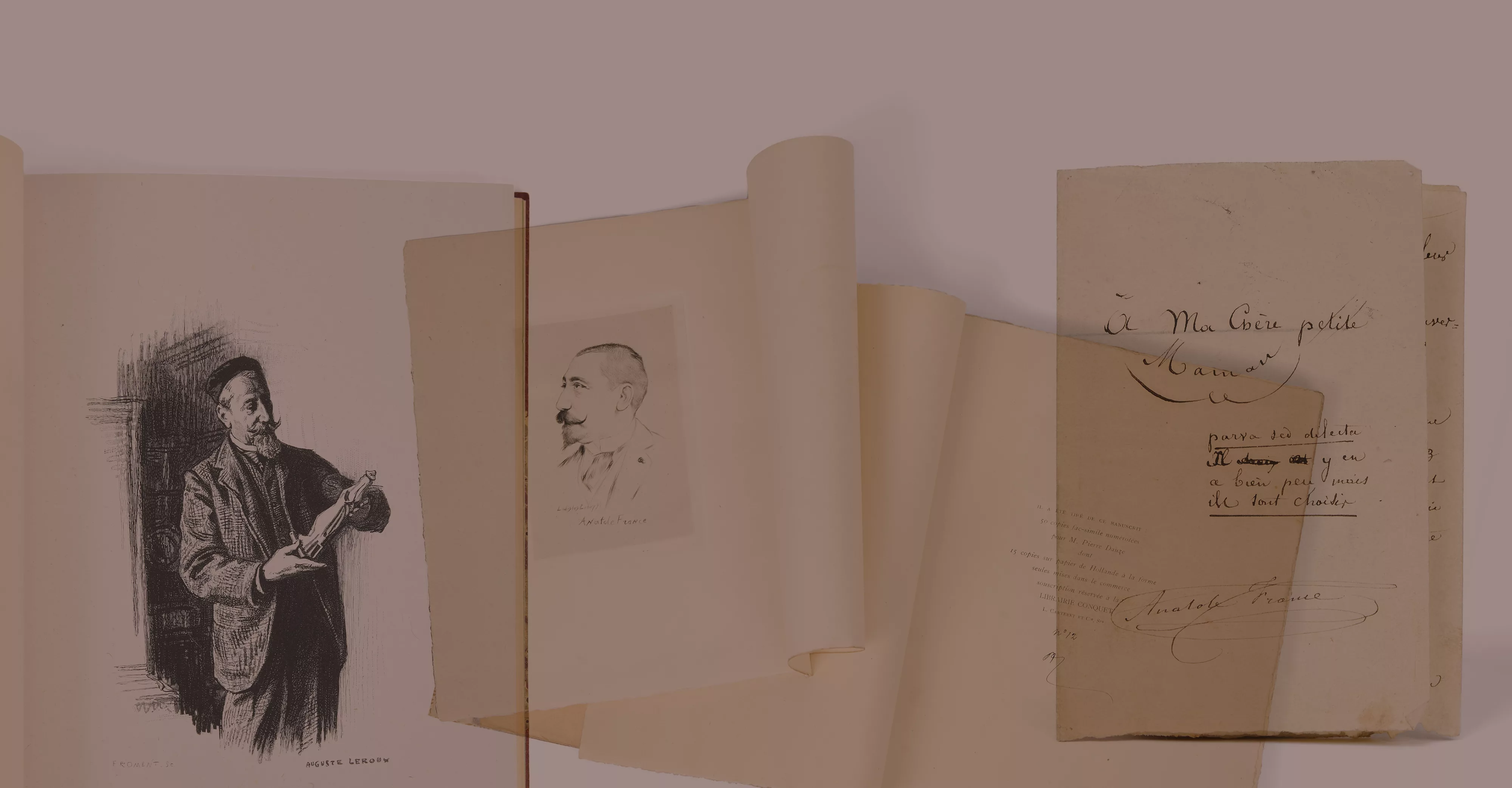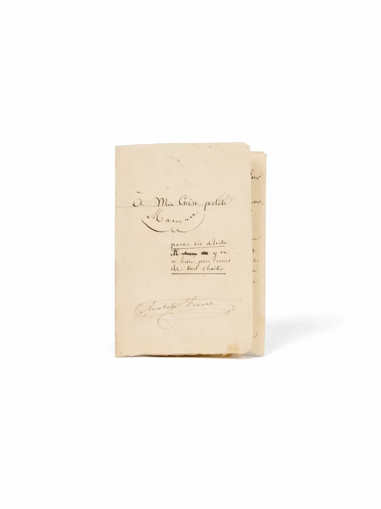 Ces éditions originales, certaines joliment reliées, sont accompagnées de quatre manuscrits de la période de l'enfance de France adressés à l’un ou l’autre de ses parents. Nous y avons ajouté les premières études et biographies qui furent publiées sur l’auteur de Thaïs entre 1924, date de sa disparition et 1960, où la Bibliothèque nationale lui consacrait une exposition.