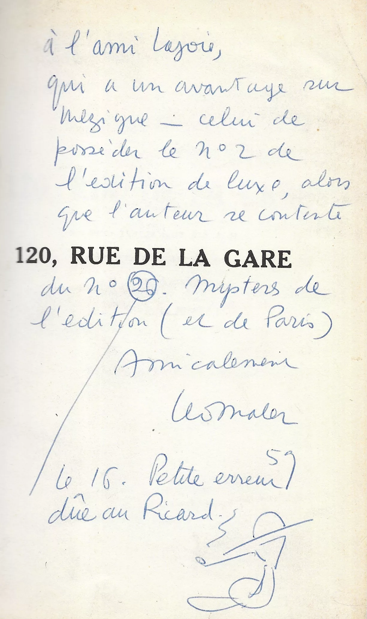 Édition originale.Un des 30 premiers exemplaires sur vélin (n° 2).Envoi signé : " à l'ami Lajoie, qui a un avantage sur mézigue - celui de posséder le n° 2 de l'édition de luxe, alors que l'auteur se contente du n° 26. Mystères de l'édition (et de Paris). Amicalement, Léo Malet, 59. [correctif :] : le 16. Petite erreur dûe au Ricard. [avec dessin autographe]."