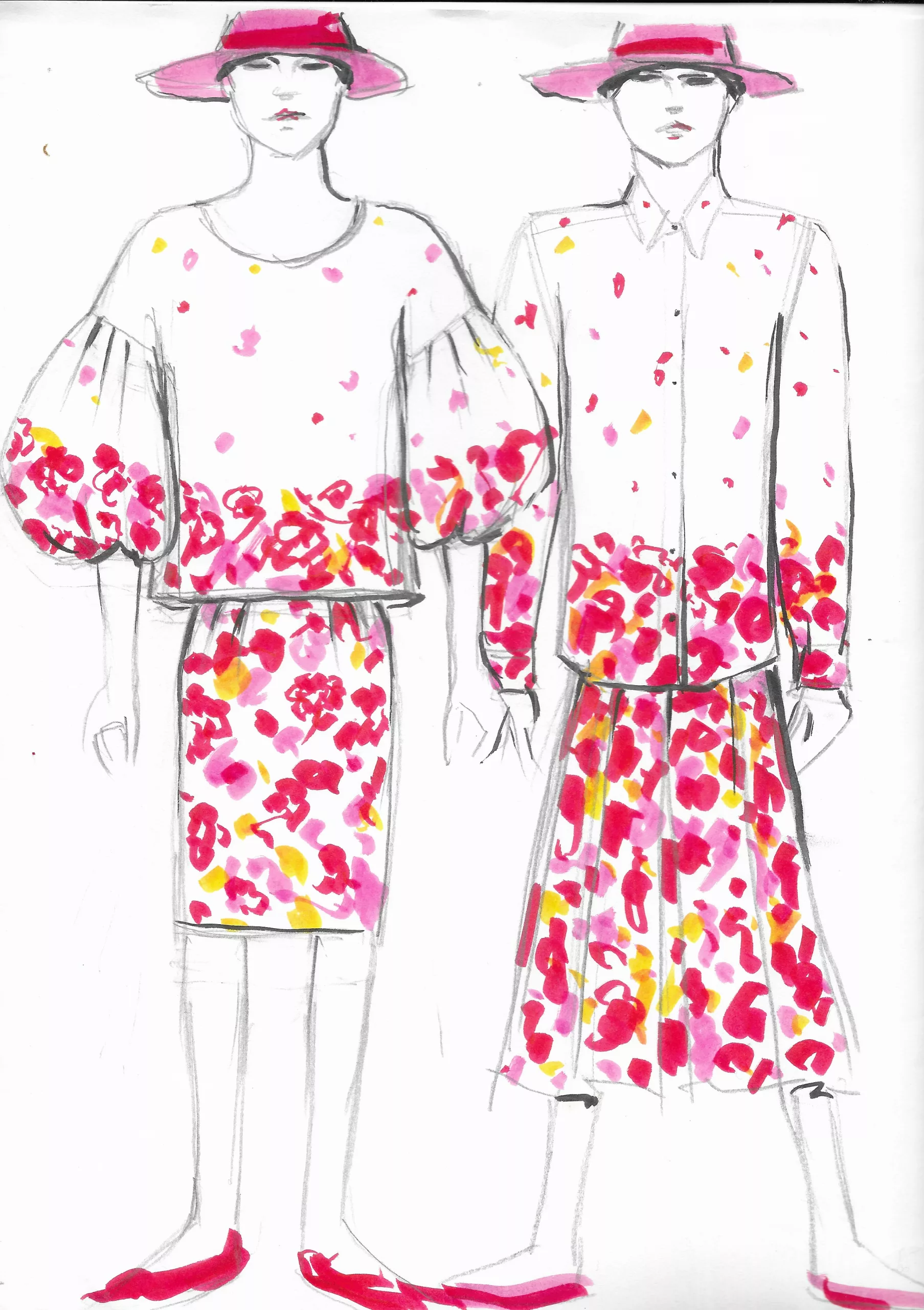 Deux beaux crayonnés, avec coloris au feutre et crayons : femmes en pied, de face, en jupe crayon et jupe ample à plis.