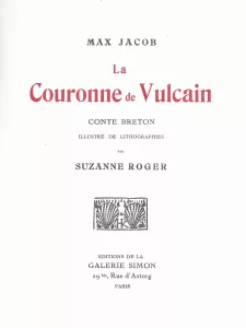 La Couronne de Vulcain. Conte Breton illustré de lithographies par Suzanne Roger. Cinquième livre de Max Jacob édité chez Daniel-Henry Kahnweiler, après Saint Matorel (1911), Frère Matorel (1912), Le Siège de Jérusalem (1914), Ne coupez-pas mademoiselle (1921).