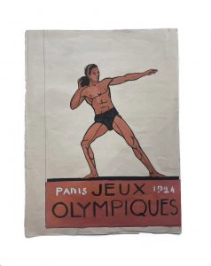 Grand dessin, encore et gouache : « le lanceur de poids », avec cartouche « Paris – Jeux Olympiques – 1924 ».