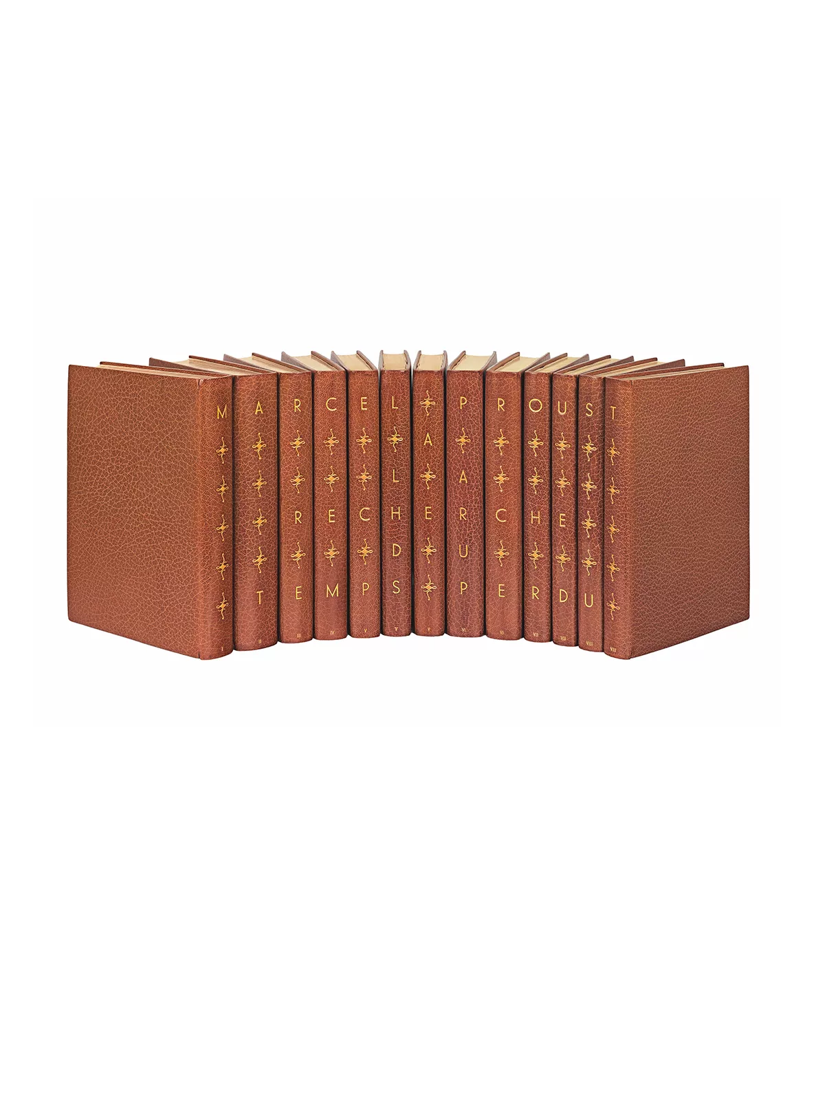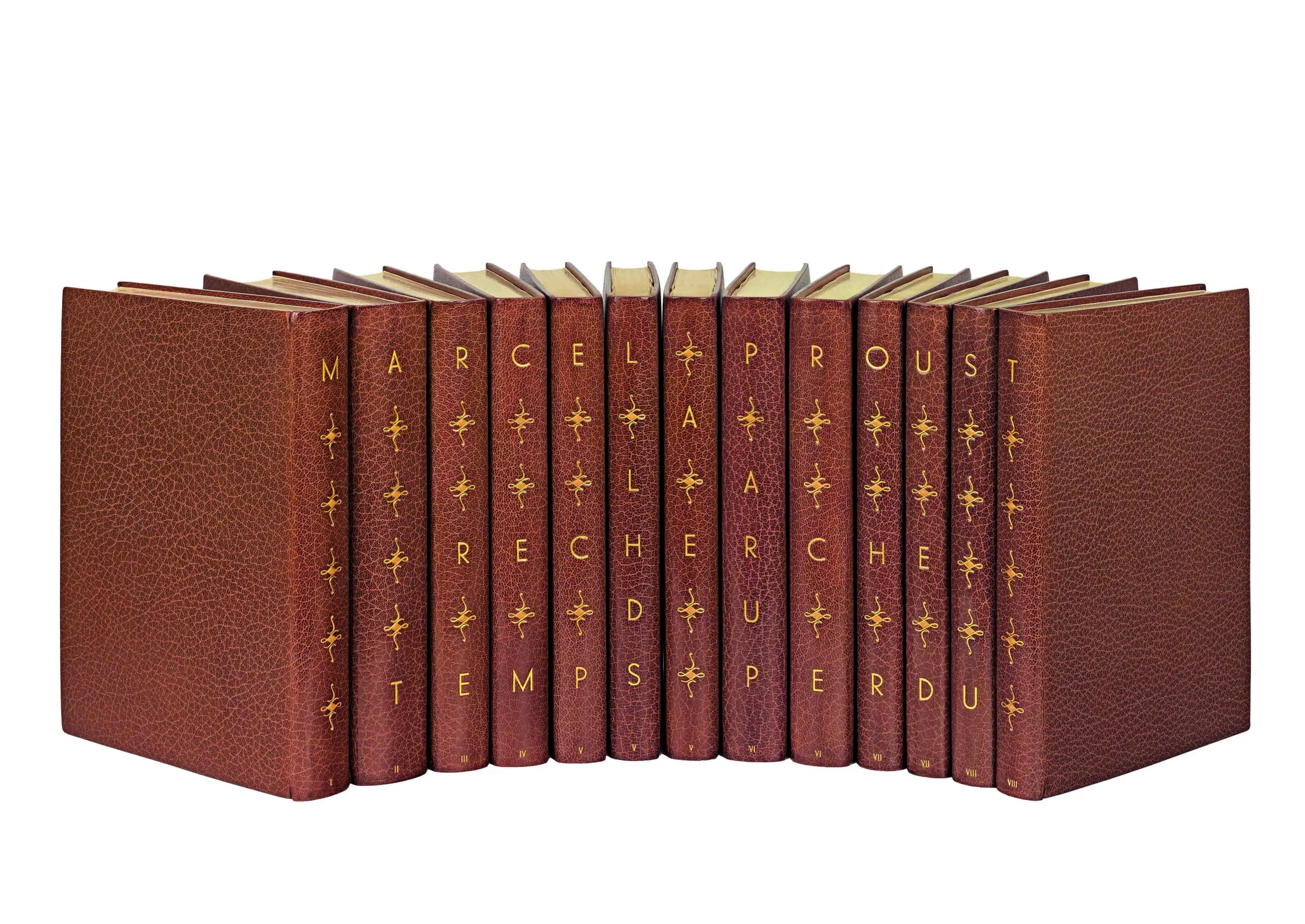 Les volumes portent ici chacun au dos un élément du titre conçu avec maîtrise : il fallut dépasser la difficulté de conjuguer le nombre de lettres (36) à celui des volumes (13). Les chemises ont été titrées à l’identique et la tomaison en pied des volumes a été également reportée sous chaque étui. Enfin, le jeu de fleurons dorés et mosaïqués d’une petite pièce de box crème est repris à l’identique sur chacune des chemises.