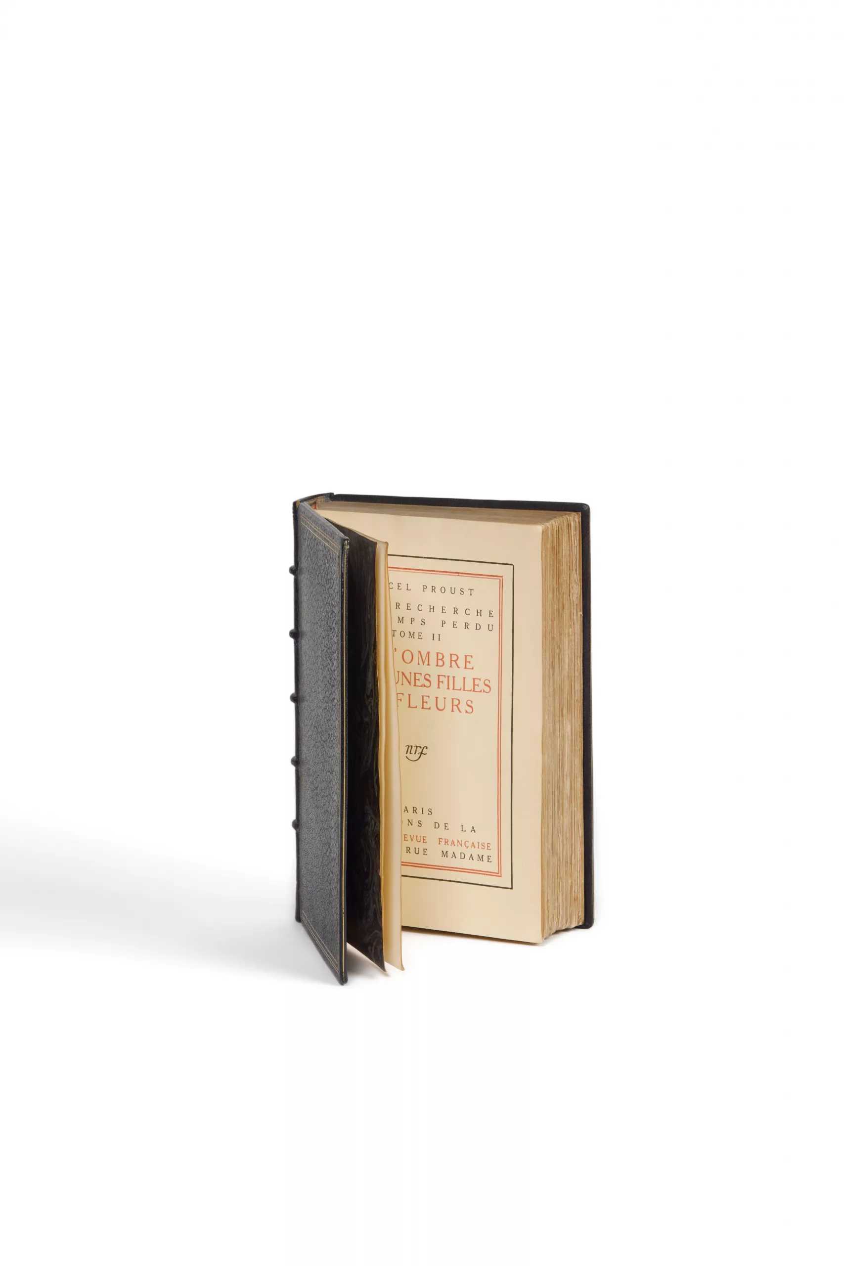 Gaston Gallimard est depuis 1916, et officiellement, le nouvel éditeur de Marcel Proust. Dès octobre 1917, il souhaite faire imprimer les volumes à venir de A la recherche du temps perdu, en profitant pour racheter à Bernard Grasset les quelques six cents exemplaires qui subsistent du stock Grasset de Du côté de chez Swann de la rue des Saint-Pères. Ces exemplaires seront remis en vente sous une recouvrure des Éditions de la NRF à l’hiver 1917. Est ensuite prévue une nouvelle imposition « maison », avec quelques amendements rendus nécessaires par les développements ultérieurs de l’oeuvre, dont l’impression ne cesse d’être retardée à cause des incessantes corrections de Proust, qui retardent d’autant la parution du tome II de la série, À l’ombre des jeunes en fleurs, dont le volume est enfin prêt à l’automne 1918 : l’imprimerie « La Semeuse » à Etampes effectue un premier tirage courant de 500 exemplaires sans mention d’édition, suivis de six autres tranches de 450 exemplaires, qui portent des mentions de « deuxième » à « septième édition », tous au même achevé d’imprimer du 28 novembre 1918. Au total, ce sont 3242 qui sortent de presses. 70 exemplaires réimposés et tirés à part sur papier Lafuma de Voiron pur fil sont annoncés : ils ne seront jamais imprimés.