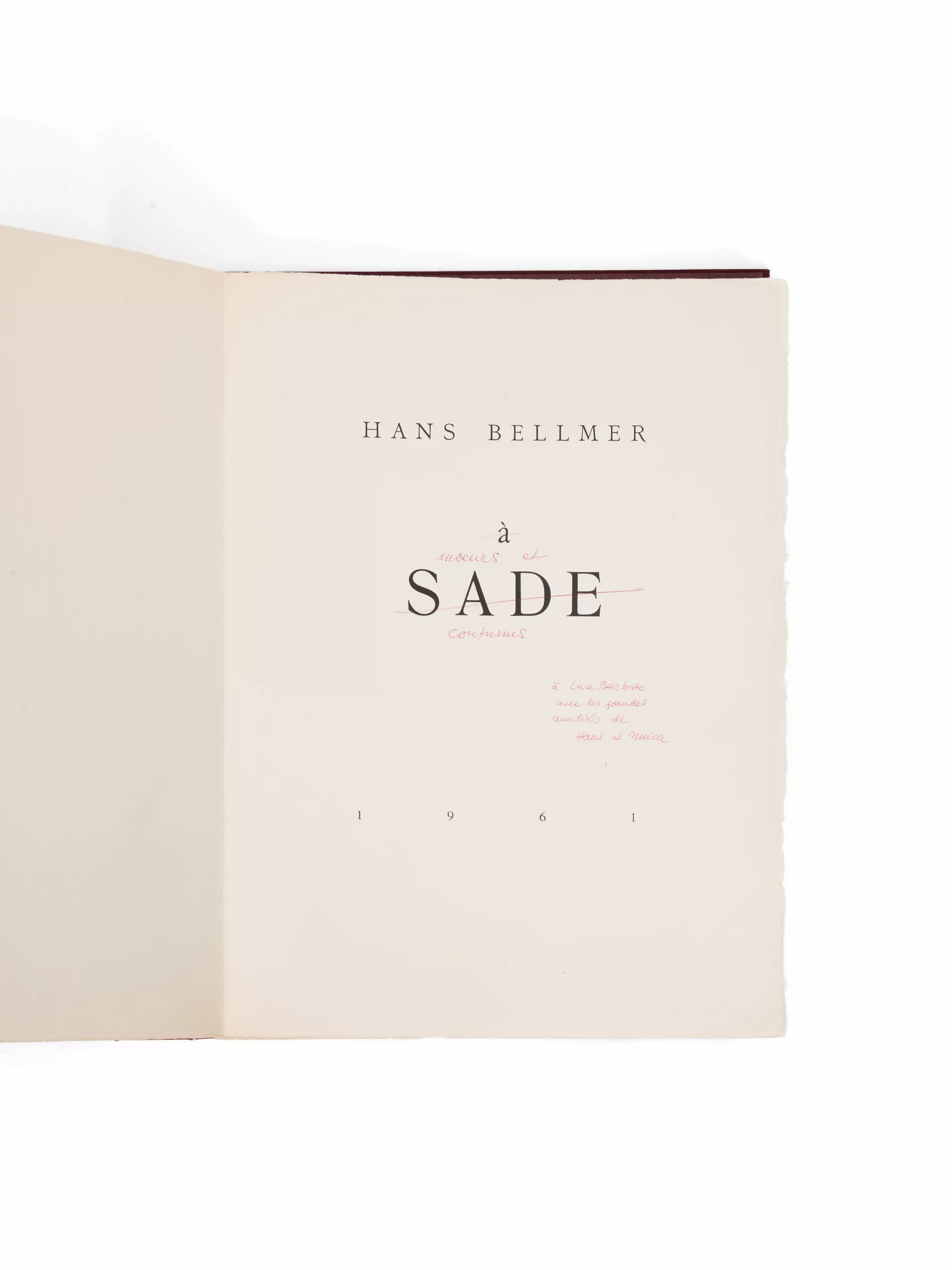 Exemplaire personnalisé par Hans Bellmer, qui a biffé le titre À Sade et l'a remplacé par « Moeurs et coutumes » et y a ajouté un grand envoi signé :