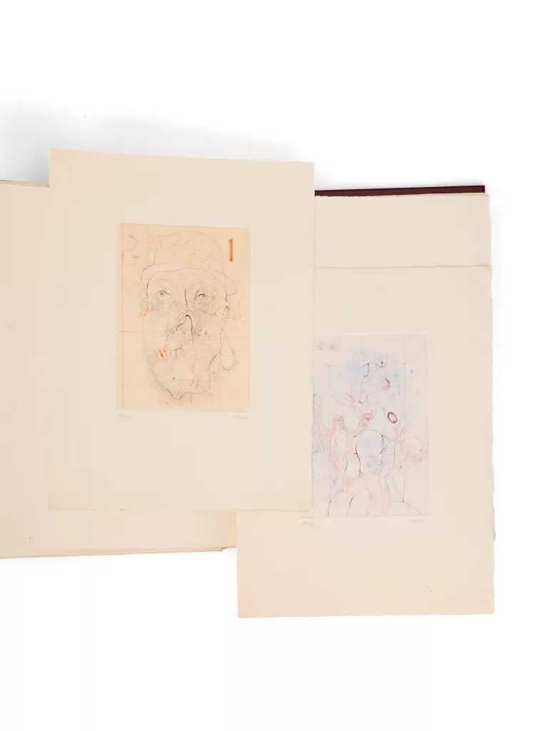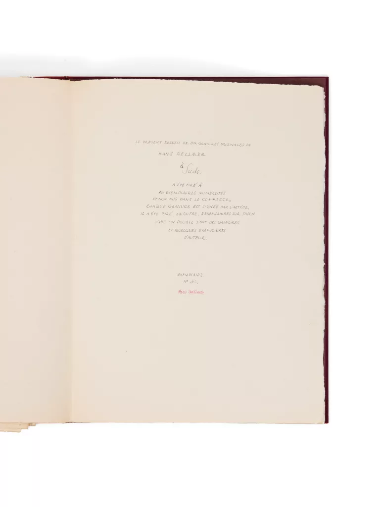 Chaque gravure, séparée par 2 feuillets blancs, est justifiée au crayon en chiffre romain et signée par Bellmer (exemplaire VIII/XX).