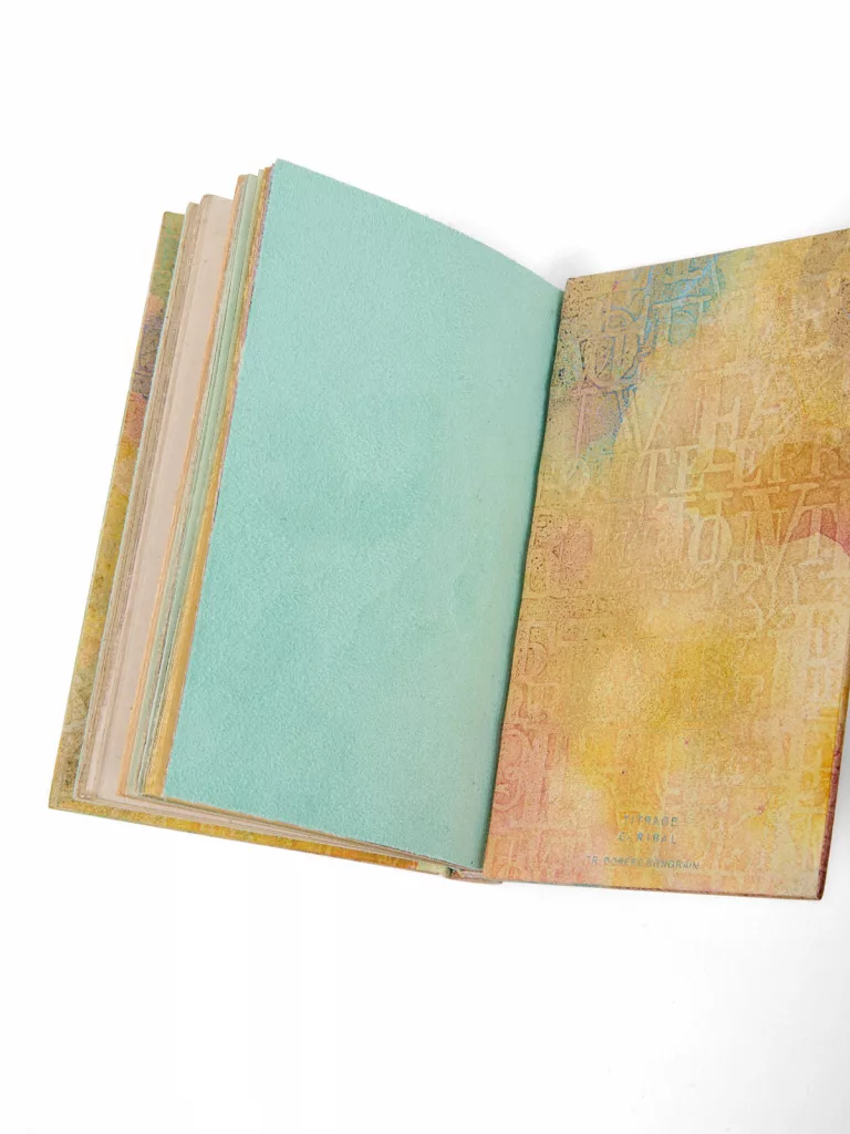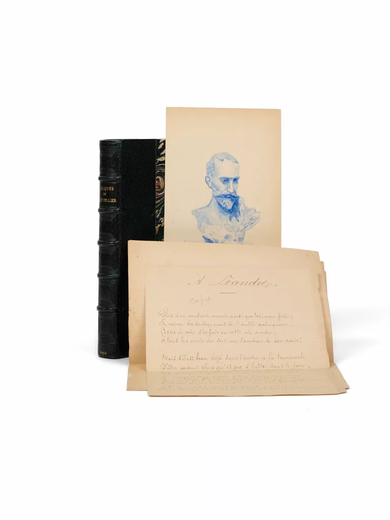 Il semble n’exister, relié par van de Walle, qu’un seul autre exemplaire sur Chine avec les papiers de couleurs : le n° 7 (Christie’s, Destribats V, n° 71). Lequel vient sans envoi. Une version recopiée du manuscrit, reliée par Paul Bonet (Carnets, 204A), a été donnée à René Char, mais sans aucune version imprimée du texte jointe.