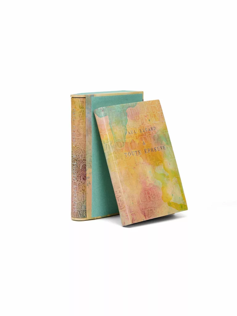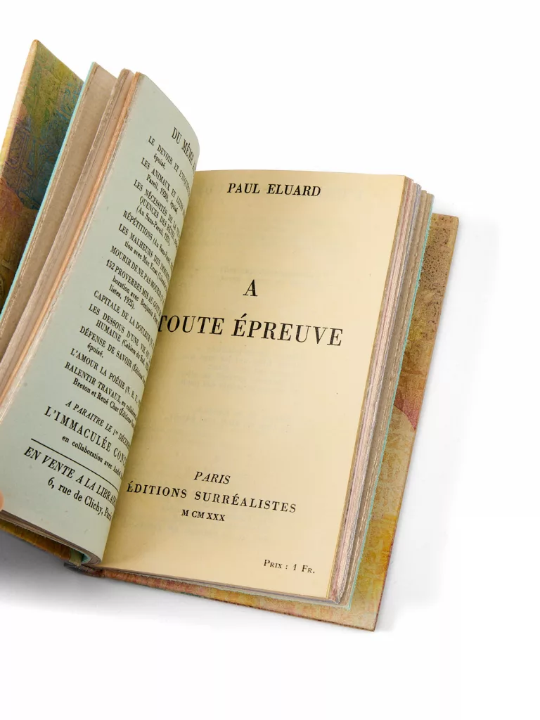 La conjonction d’un grand papier sur Chine avec l’inscription à Tanguy, la suite des tirages sur papiers de couleurs, l’adjonction de la plaquette de Victor Hugo et la délicate reliure de Louise Bescond placent cet exemplaire parmi les tous premiers au rang des exemplaires de référence de À toute épreuve. Si ce n’est au premier rang.