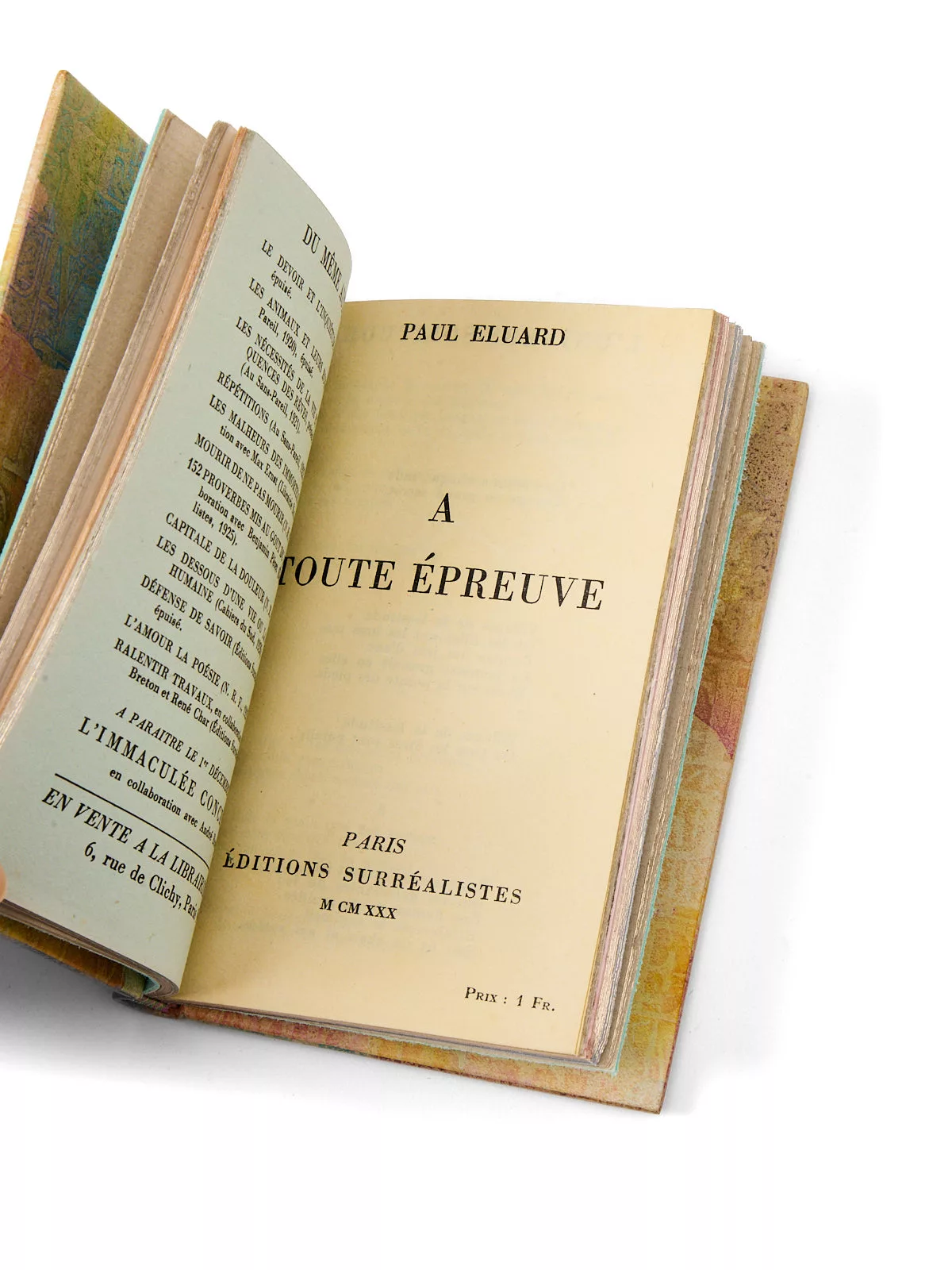 À la suite, sont reliés un exemplaire sur papier d'édition et un jeu d'exemplaire sur papiers de couleurs (saumon, vert, jaune, rose), puis un exemplaire de la plaquette qui servit de modèle à Paul Éluard pour composer la maquette : Victor Hugo, Lettre à Lord Palmerston, publiée à Jersey en 1854]. Soit un ensemble de sept plaquettes.