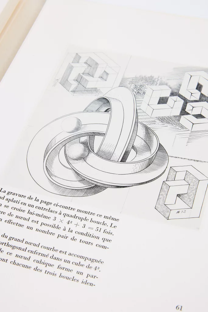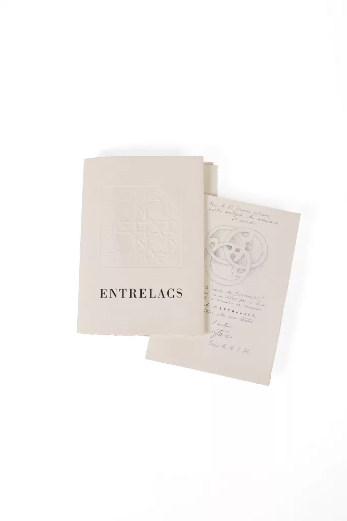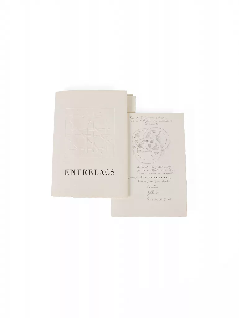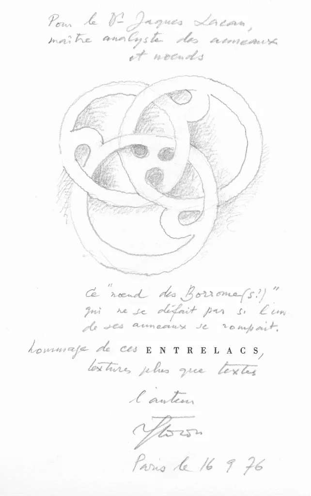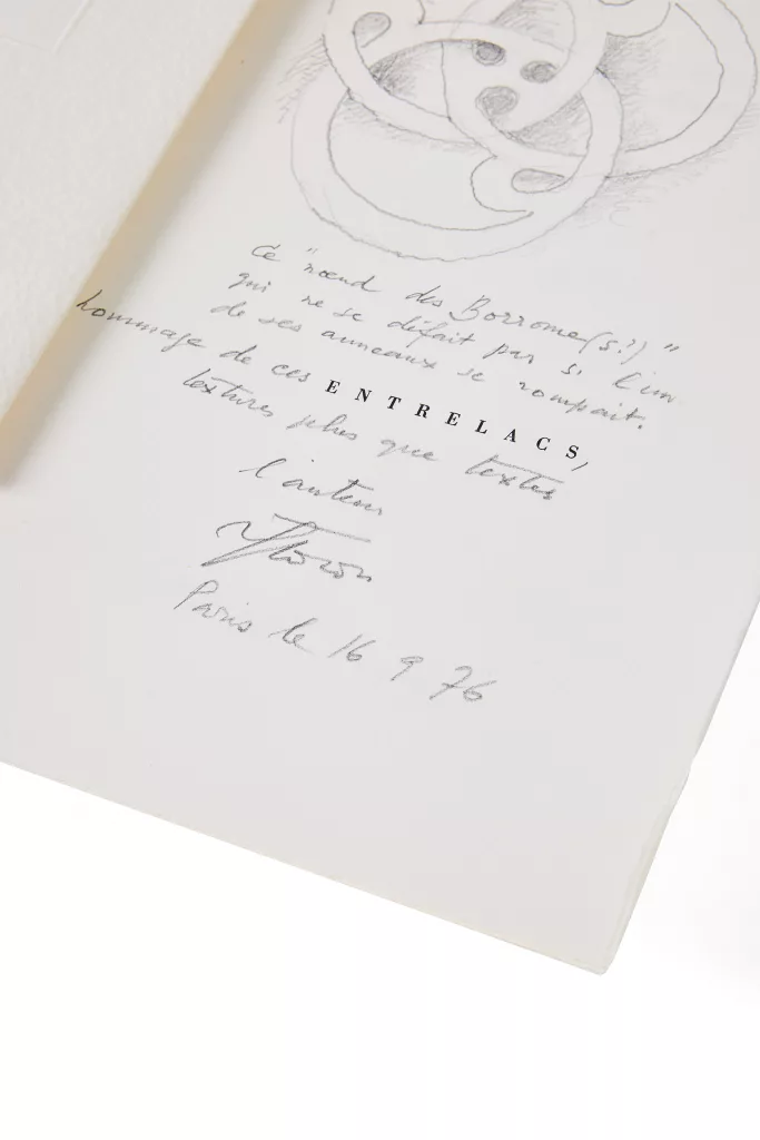 L'exemplaire de Jacques Lacan, avec un envoi et dessin à la mine de plomb signé : "Pour le Pr. Jacques Lacan, maître analyste des anneaux haineux [grand dessin], ce 'noeud des borrome(s?)' qui ne se défait pas si l'un de ses anneaux se rompait. Hommage de ces [Entrelacs], textures plus que textes. Flocon 16 9 76".