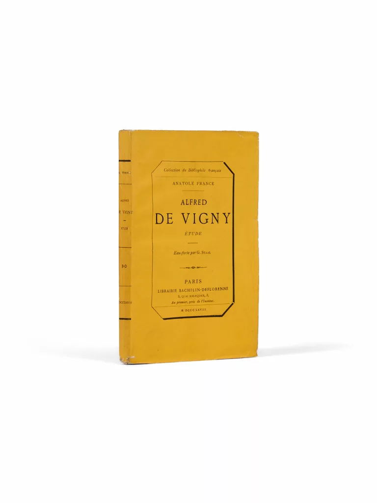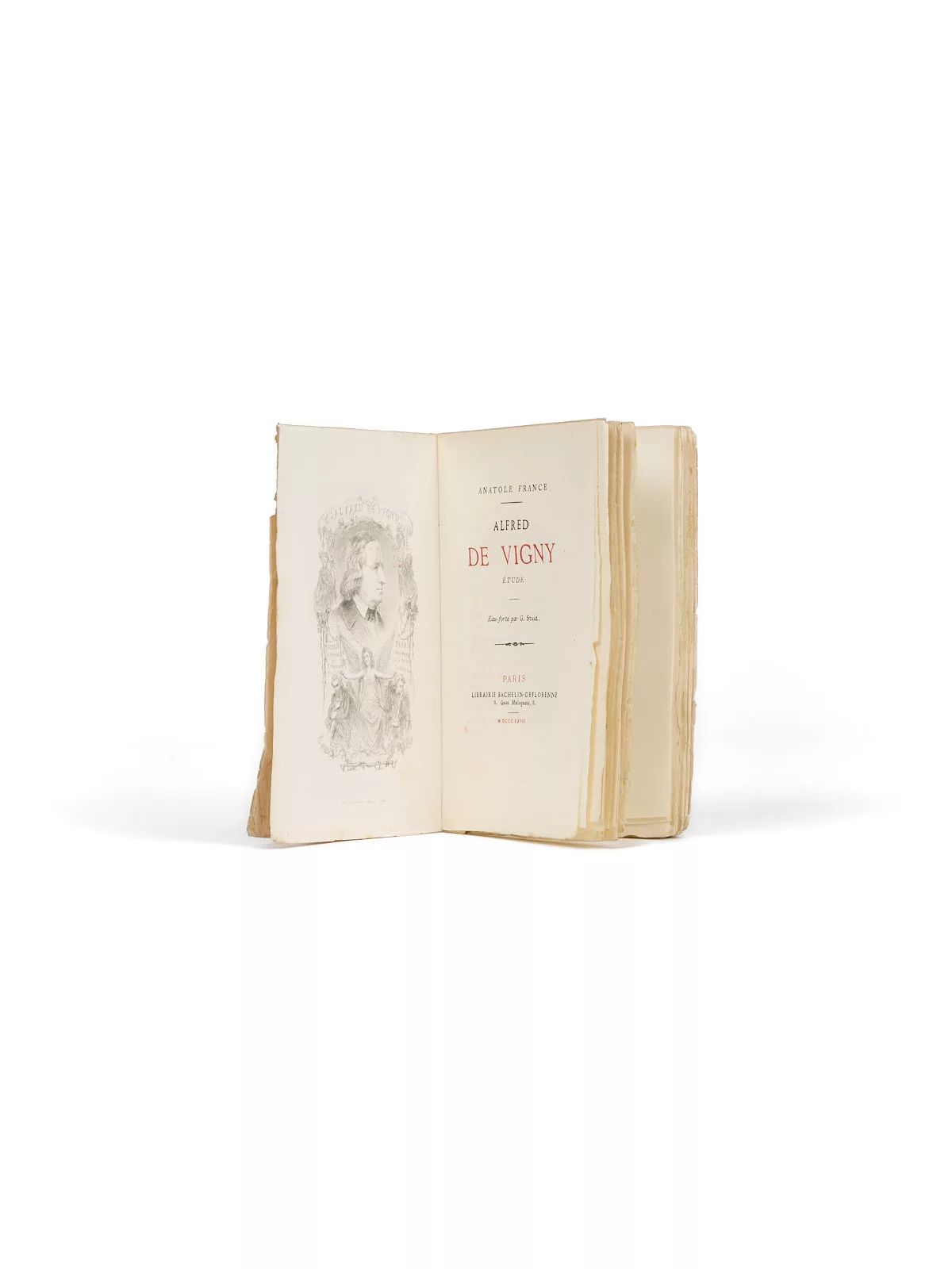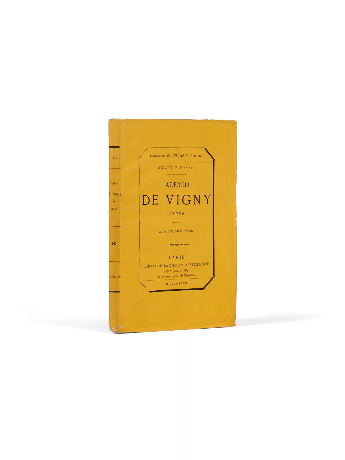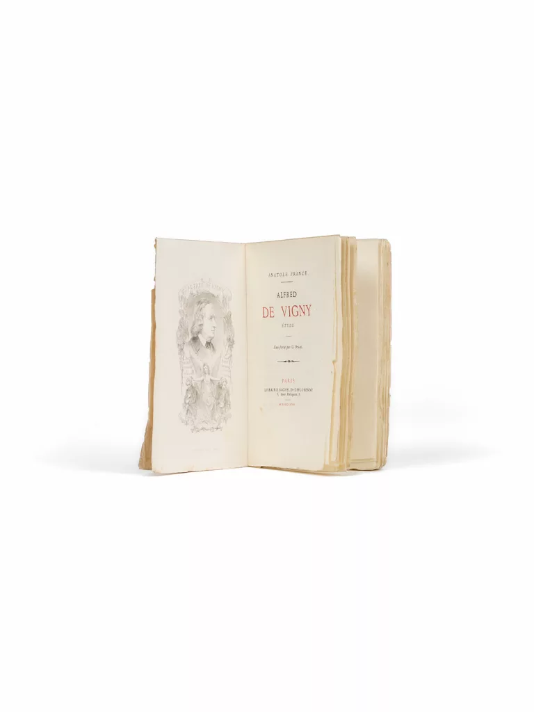 Mais France lorgnait plutôt du côté de la fonction publique et attendra encore presque dix ans un poste à la Bibliothèque du Sénat. Sans doute cela convenait davantage à l’esprit rêveur et nonchalant qui était le sien. Pour l’heure son premier livre venait de paraître – après une publication devenue très rare qui fut composée alors qu’il était encore au collège Stanislas, La Légende de sainte Radegonde. Son Alfred de Vigny, outre quelques exemplaires sur vélin, avait été imprimé à un unique exemplaire sur peau de vélin (coll. Louis Barthou) où France nota plus tard : « Ce petit ouvrage remonte à un temps où je ne savais ni écrire, ni travailler. Il est le pitoyable monument de ma frivole jeunesse. »