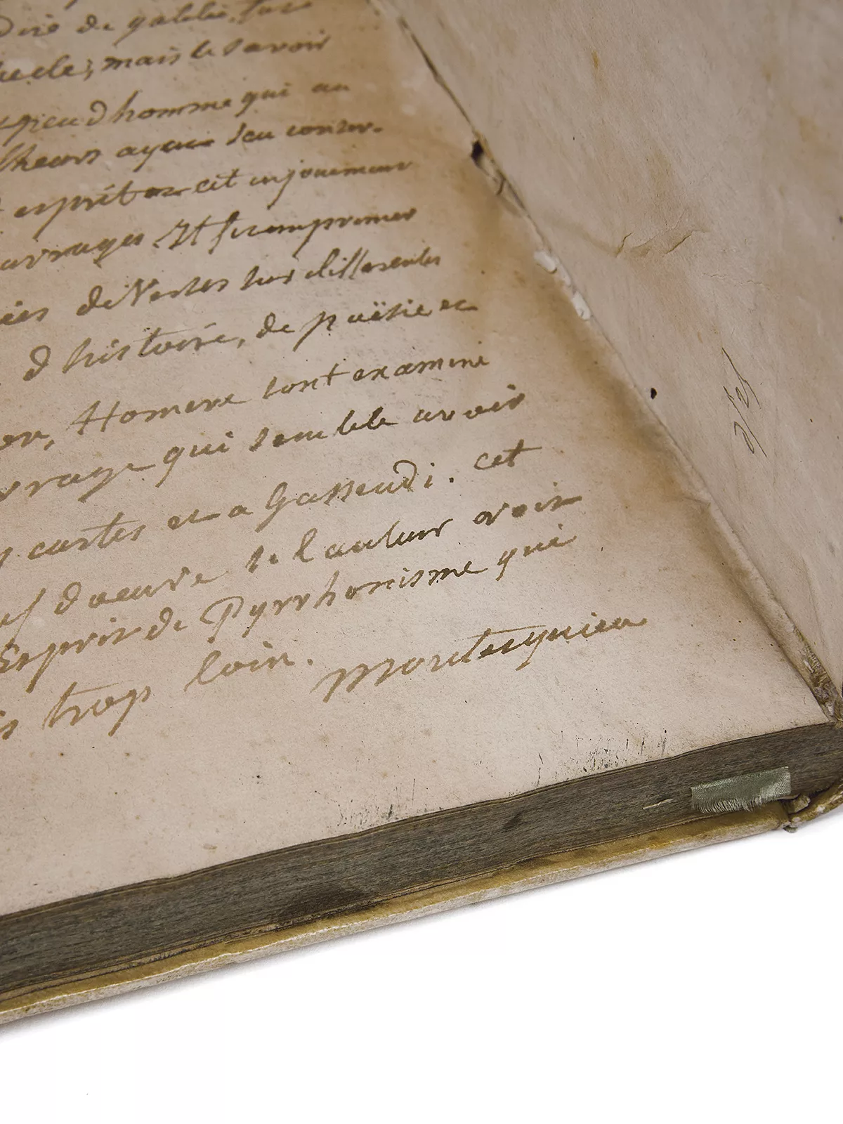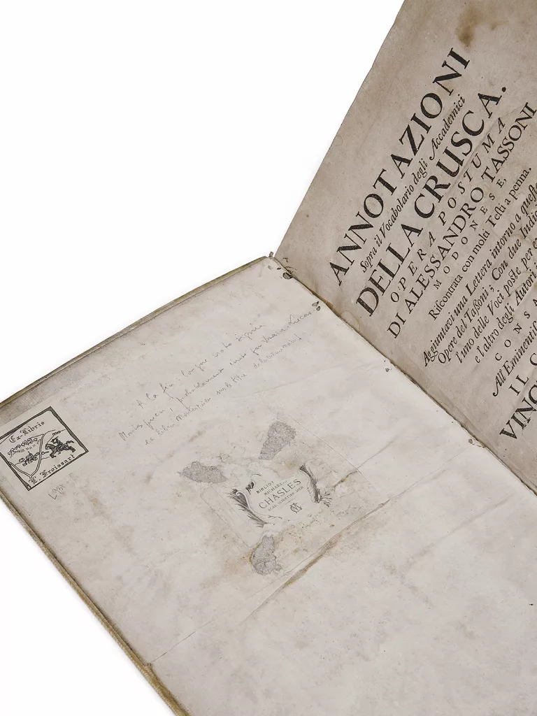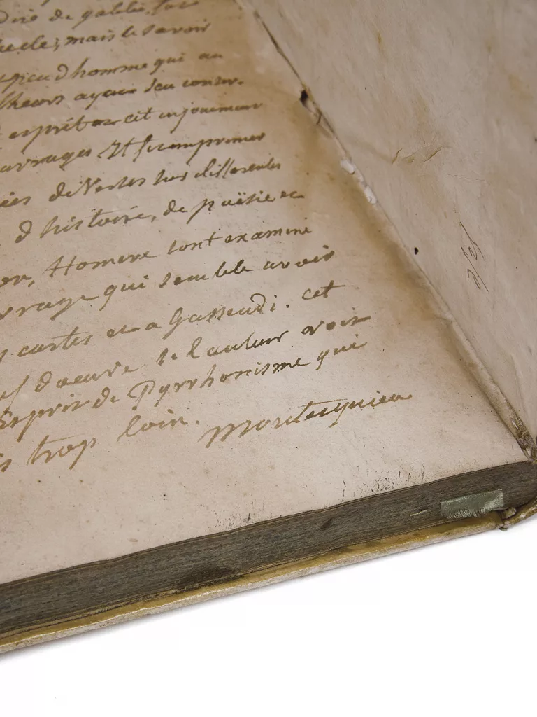 Ex-libris autographe prétendument de Montesquieu en page de titre et longue note en fin, également signée « Montesquieu (...) j'ai rapporté ce livre d'Italie », avec une longue note citant les grands noms de la philosophie.