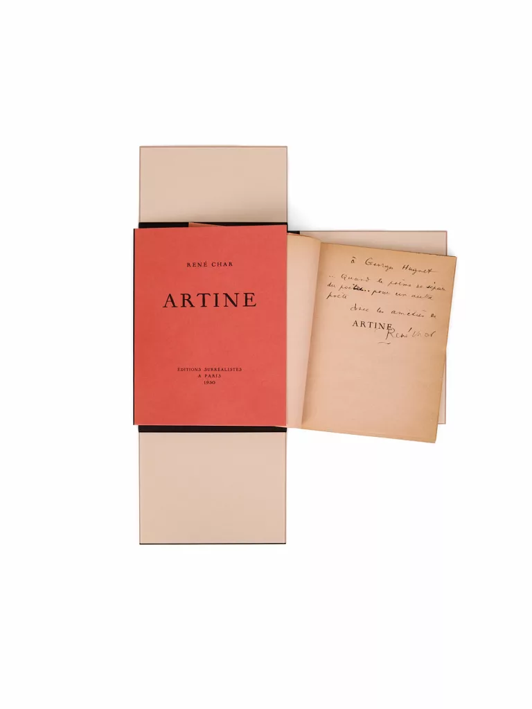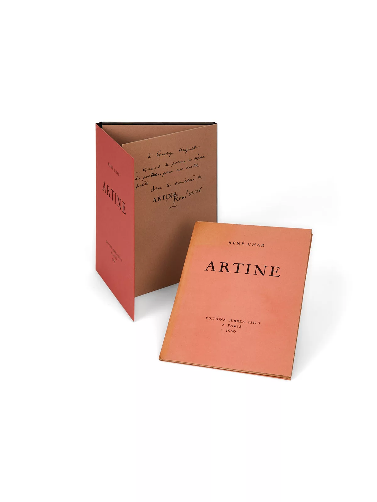 Deux ans avant Ralentir Travaux, Artine marque le premier rapprochement, déterminant, entre Char, Breton et Éluard. Char fera à ce dernier le plus beau des cadeaux une fois le texte publié : il lui offrira le manuscrit d’Artine, rédigé sur papier jaune. Éluard le conservera jusqu’à sa mort, avant que René Char ne le récupère. Lequel, lui aussi, le gardera aux Busclats toute sa vie.