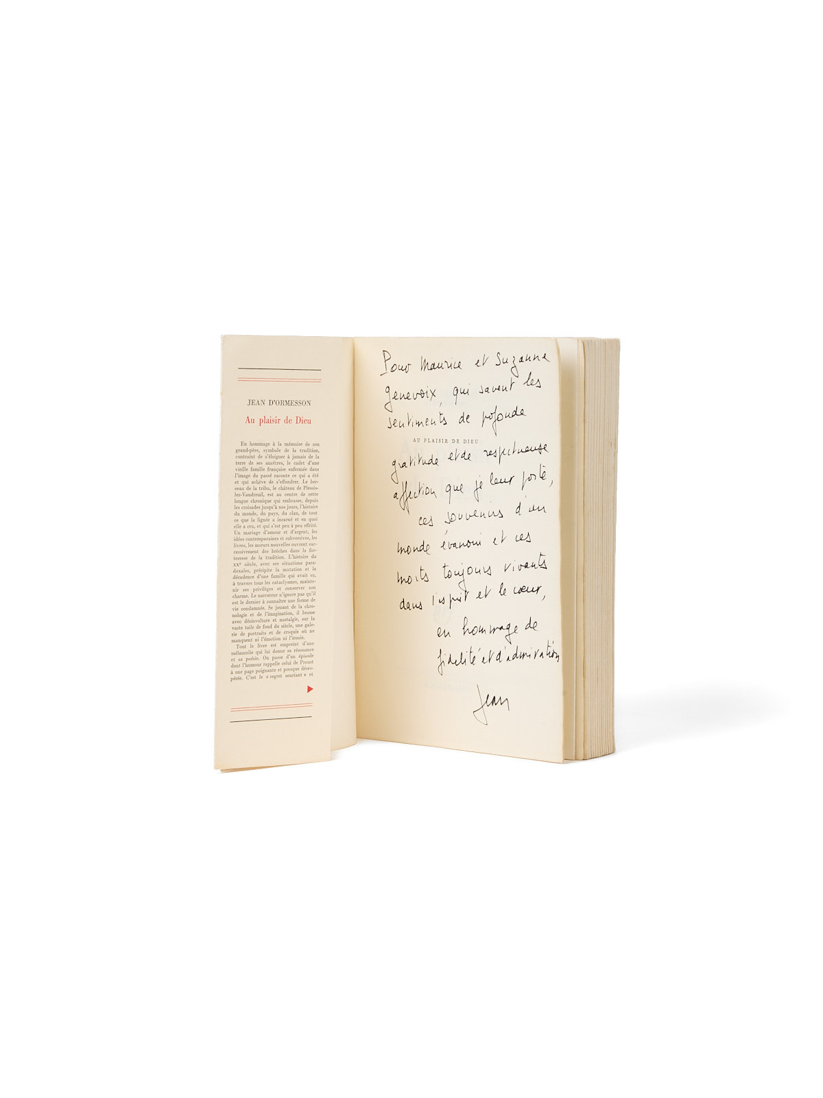 Au plaisir de Dieu est la premier livre que d’Ormesson publie depuis son accession à la Coupole, le 18 octobre 1973, au fauteuil de Jules Romains, alors que Genevoix y est encore le secrétaire perpétuel. « Le sujet du roman […] c’est l’insertion de cette vieille société familiale non point paternaliste, mais patriarcale, dans la société contemporaine dont les structures tendent à s’effacer. » Avec cette oeuvre construite comme une rétrospective affective d’une histoire vécue, Jean d’Ormesson assoit définitivement sa réputation : un moyen pour lui de raconter son propre cheminement et celui de la famille Lefèvre d’Ormesson dont il porte le titre de comte, et de raconter son enfance passée dans le château maternel de Saint-Fargeau, qu’il sera contraint de vendre, à contrecoeur, expérience vécue comme un « drame ».