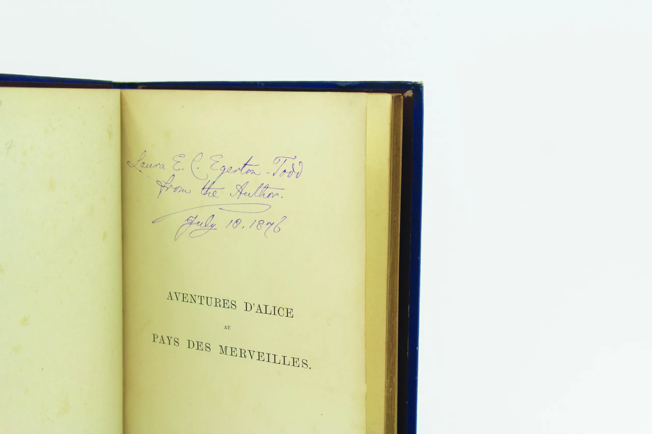 Exemplaire émouvant, puisqu’il est offert à une certaine Laura Todd, alors âgé de douze ans – exactement l’âge d’Alice Liddell lorsque Carroll lui offrit, comme cadeau de Noël 1864, la première version du livre. Laura [Emma Chamberlain Egerton] Todd est la première fille de William Egerton Todd, colonel dans la Loyal Lincoln Volunteers, un fameux régiment d’infanterie britannique de la British Army.