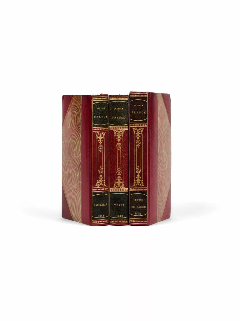 Charmantes reliures uniformes de Visinand pour les deux premiers recueils de nouvelles d’Anatole France et son célèbre Thaïs.