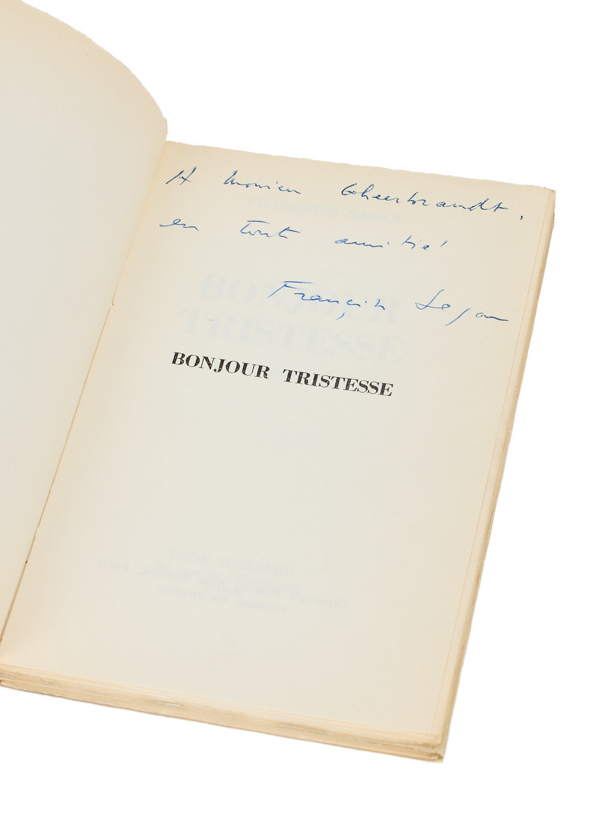 L’édition originale, datée du 5 mars 1954, comportait un tirage en grand papier de 30 exemplaires sur alfa. Ce nouveau tirage de décembre lui fait suite. Un des 200 exemplaires hors commerce sur Corvol l’Orgueilleux, imprimés pour « Noël 1954 ». Envoi signé : « À Monsieur Gheerbrant, en toute amitié. Françoise Sagan ».
