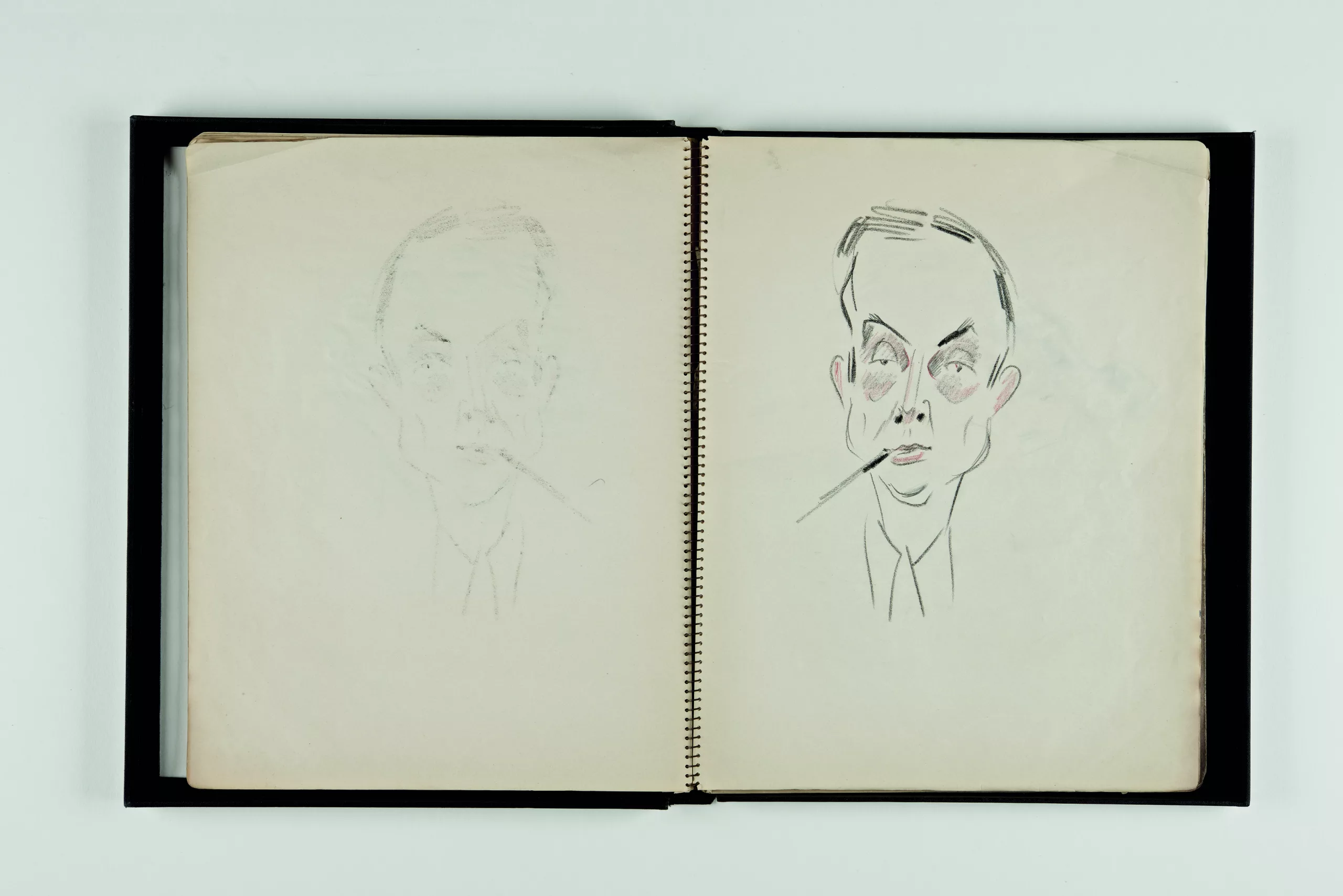 Ce joli carnet de croquis présente de nombreuses esquisses, dessins préparatoires et croquis – certains en couleurs figurant des portraits, des silhouettes (artistes de cirque) et une nature morte.