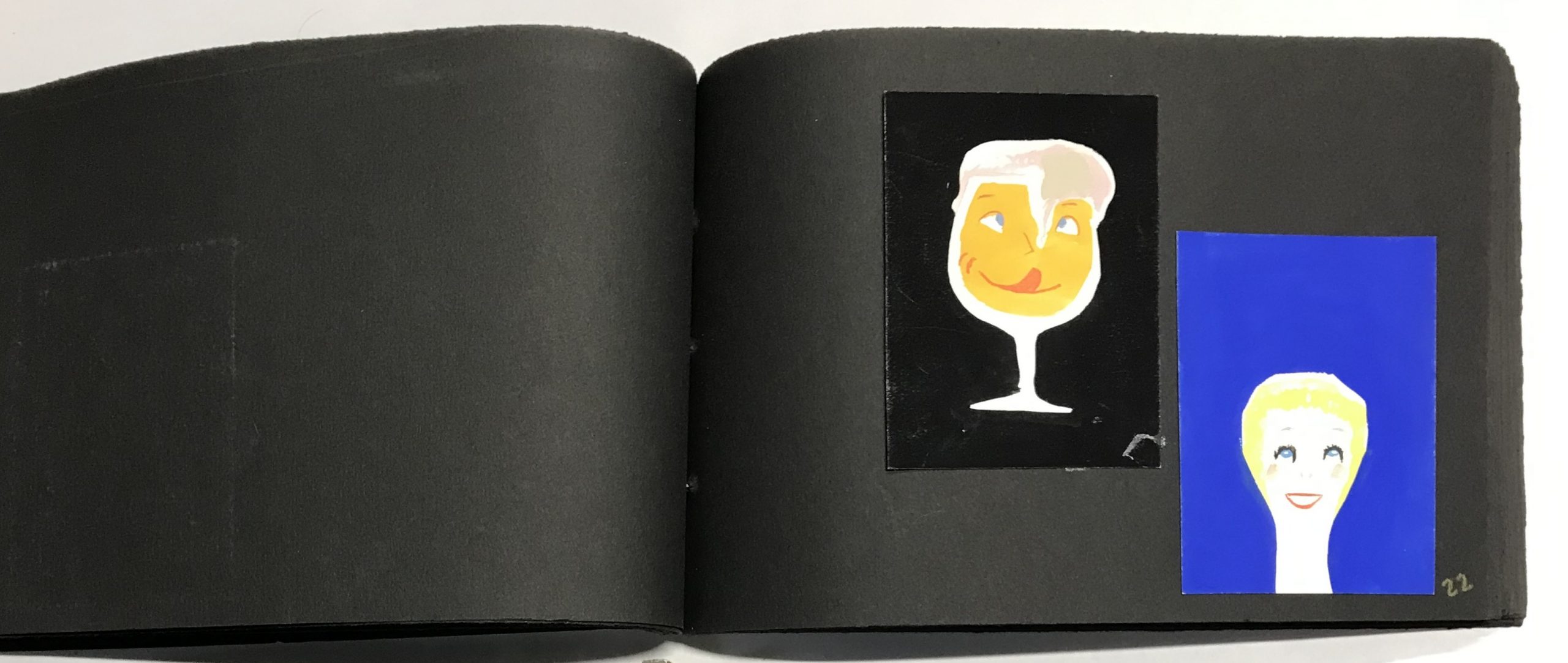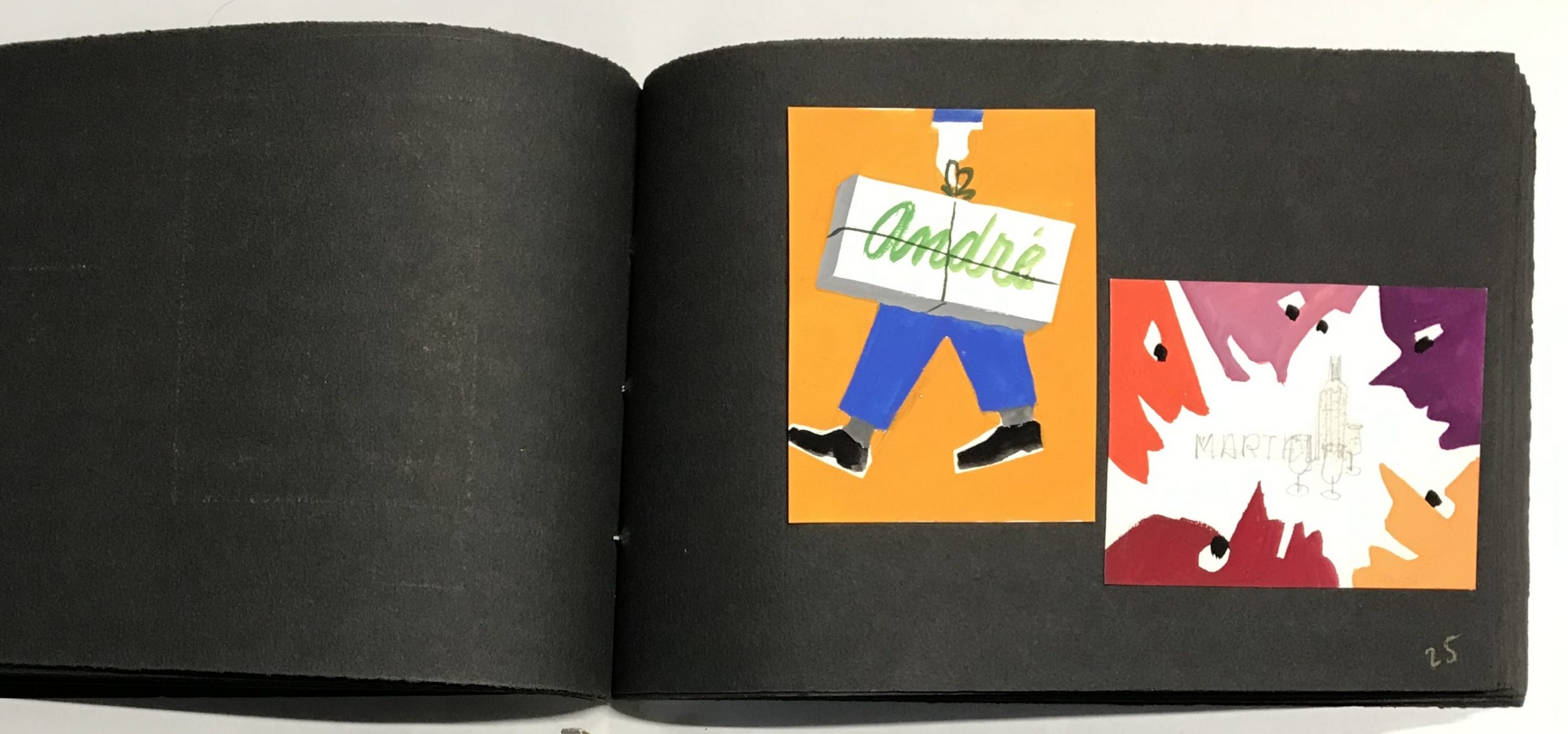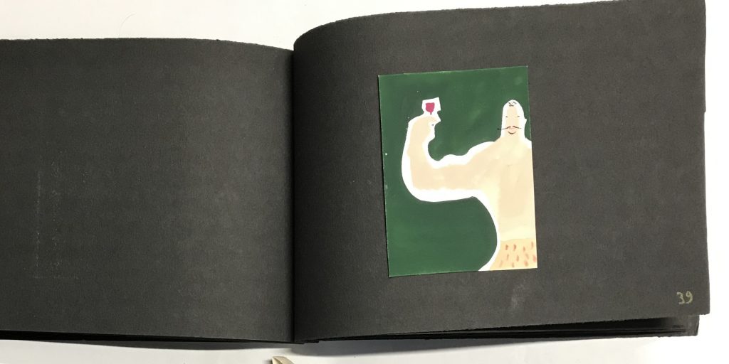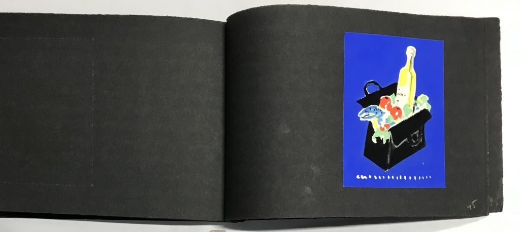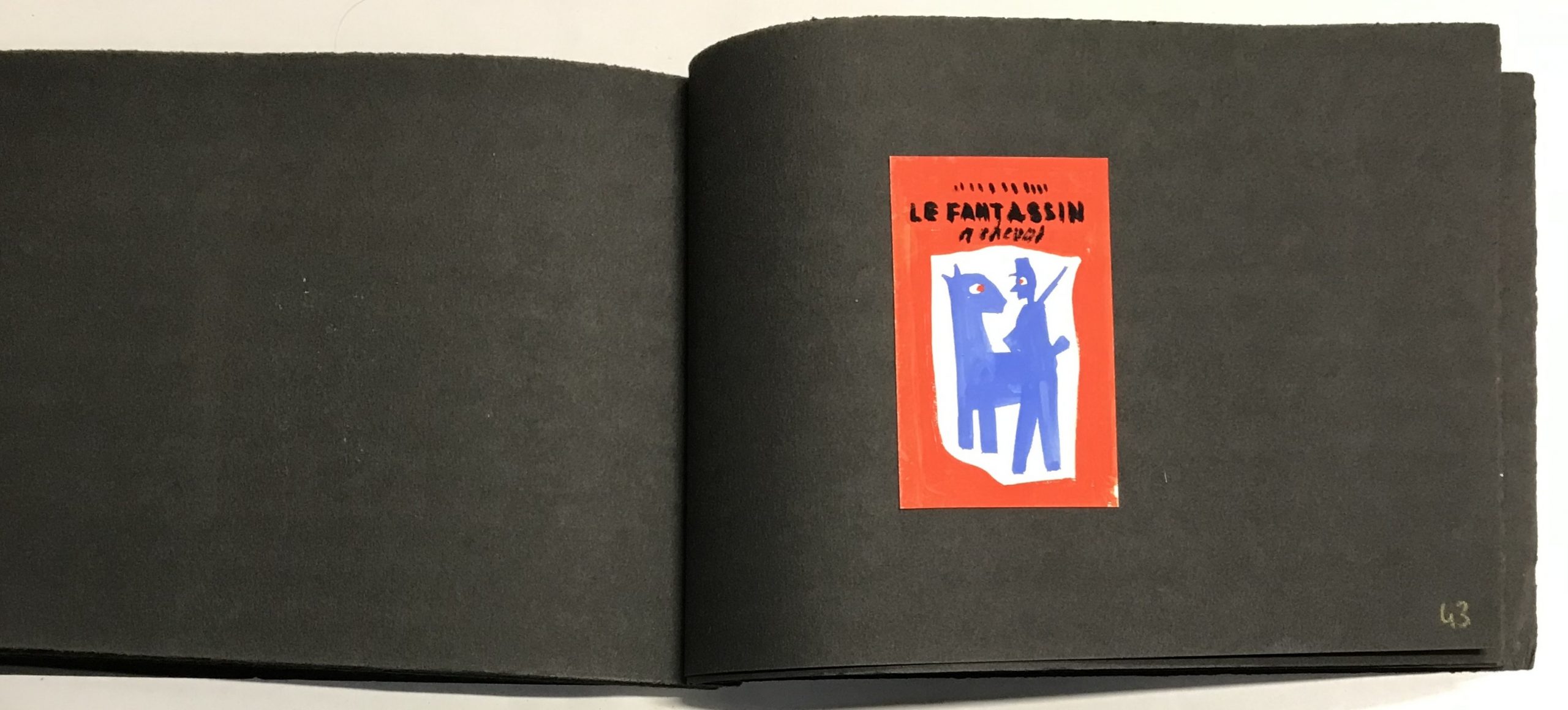 Gouaches sur bristol de formats divers, contrecollées sur canson noir (255 x 170 mm), 47 p. ch., reliées par une cordelette.