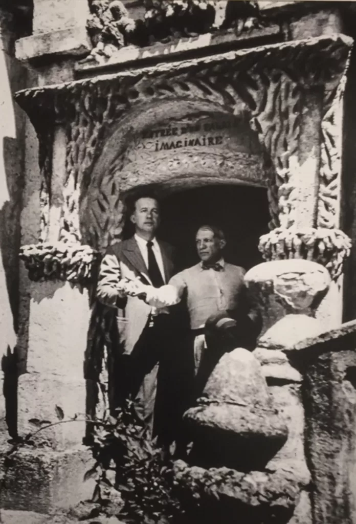 Dora Maar immortalisera le moment par une photographie représentant les deux amis à l’entrée du « Palais imaginaire ». Leur goût partagé pour l’art naïf et l’univers onirique, cher aux surréalistes, les rassemble et trouve un écho dans ce monument singulier. Ce même jour, le groupe achète une carte postale des lieux, que la poste de Mougins expédie quelques jours plus tard au 40 rue Denfert-Rochereau à Paris, chez Man Ray.