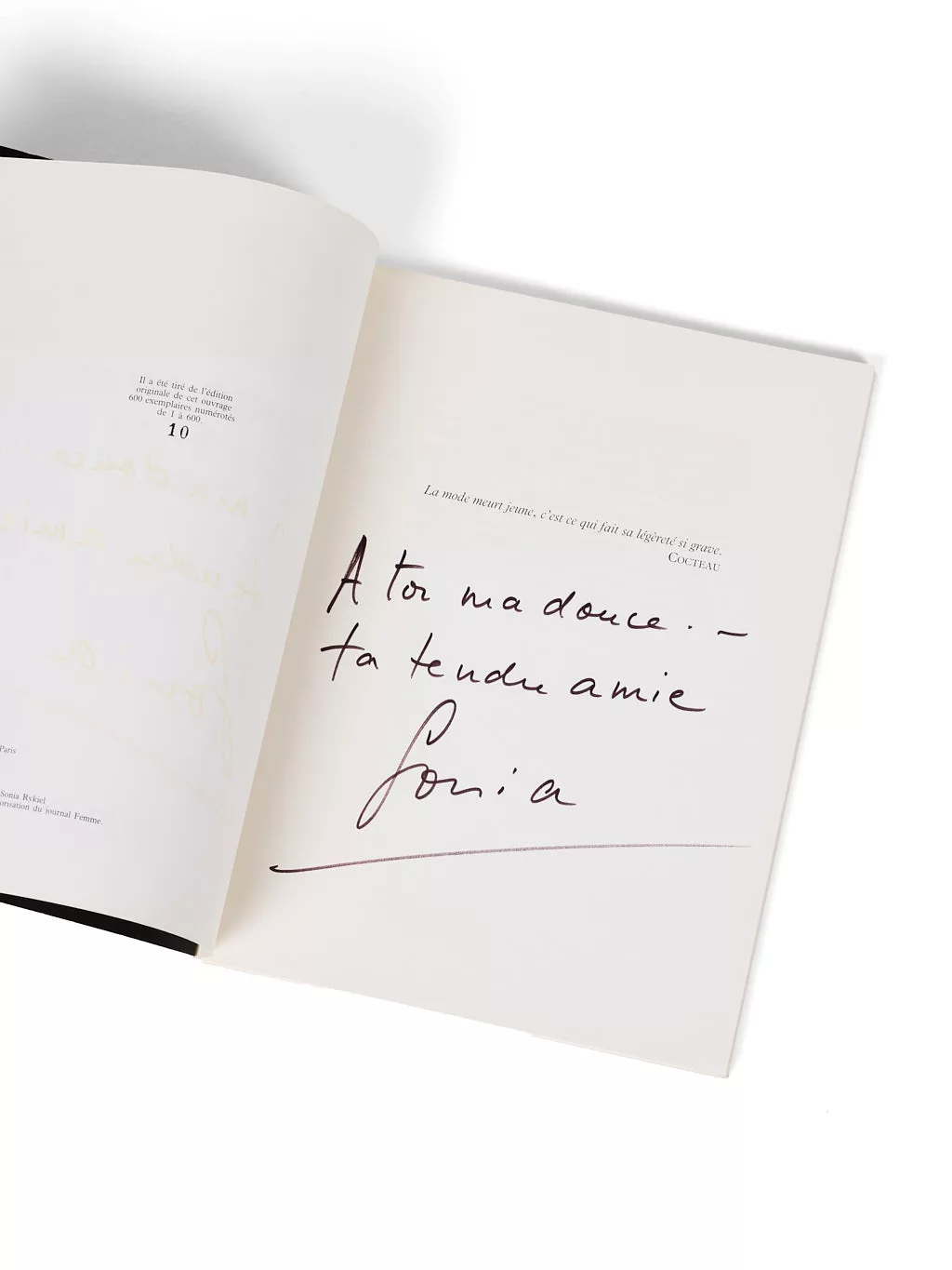 Envoi signé à Régine Deforges, « à toi ma douce, ta tendre amie... Sonia ».