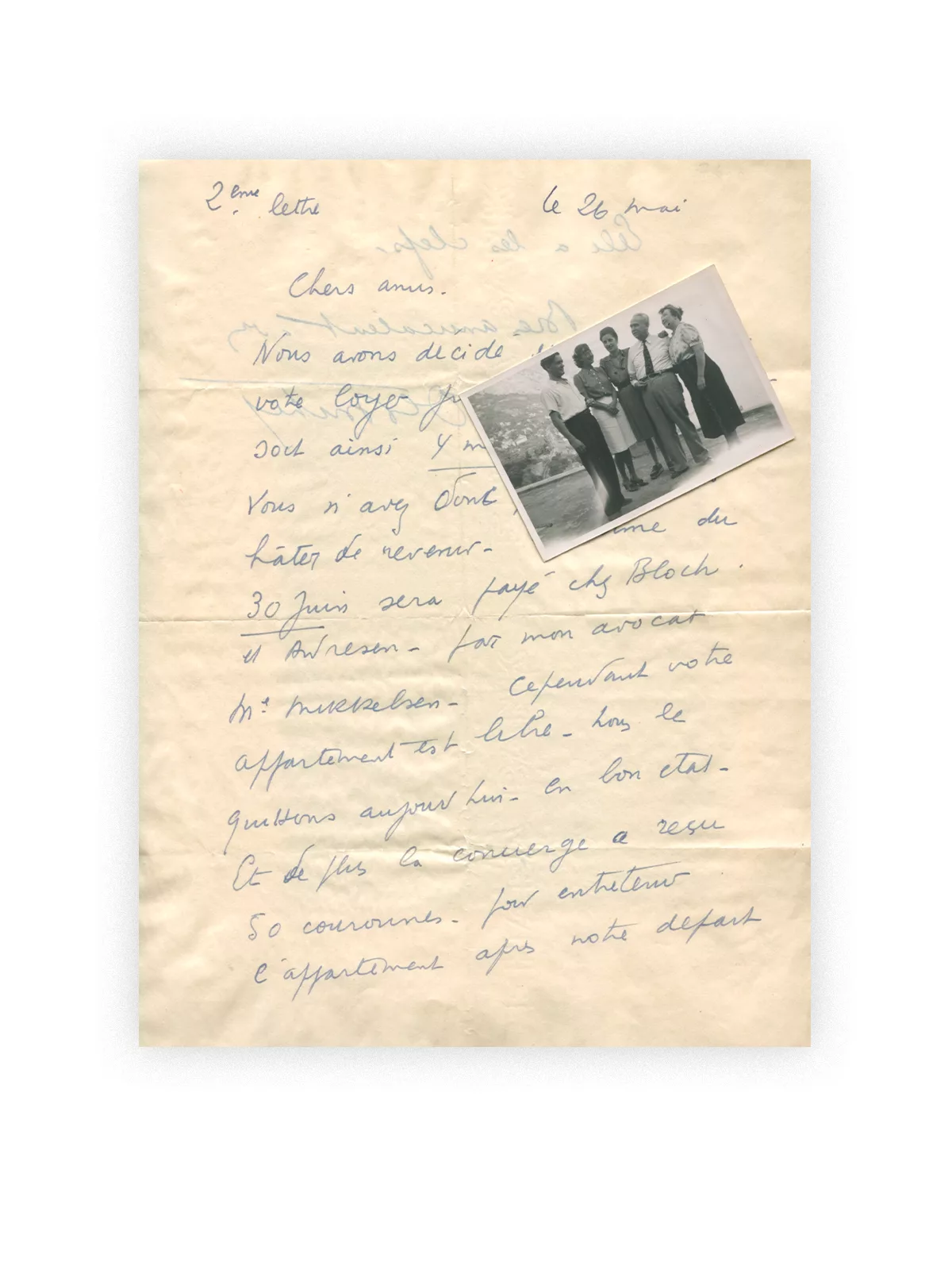 * Une lettre autographe signée (210 x 297 mm), recto-verso, sur le vergé jaune qu’employait Céline pendant l’exil, à l’encre bleue, écriture très lisible, datée Copenhague le 26 mai 1948 et signée « L.F. Destouches » : « Chers amis, Nous avons décidé de payer encore votre loyer jusqu’au 30 septembre soit ainsi 4 mois d’avance. Vous n’avez donc point à vous hâter de revenir […]. Cependant votre appartement est libre. Nous le quittons aujourd’hui » – lettre qui pose d’ailleurs un minuscule problème de chronologie, puisqu’il est communément admis que les Destouches s’installent à Korsör le 19 mai 1948 (voir Éric Mazet, « Repères chronologiques Avril-Mai 1948 », in Lettres à Antonio Zuloaga, p. 101). On sait par le témoignage d’Else Jensen que l’appartement fut rendu dans un parfait état de propreté et que Céline ne ménagea pas sa reconnaissance aux Jensen pour leur hospitalité.