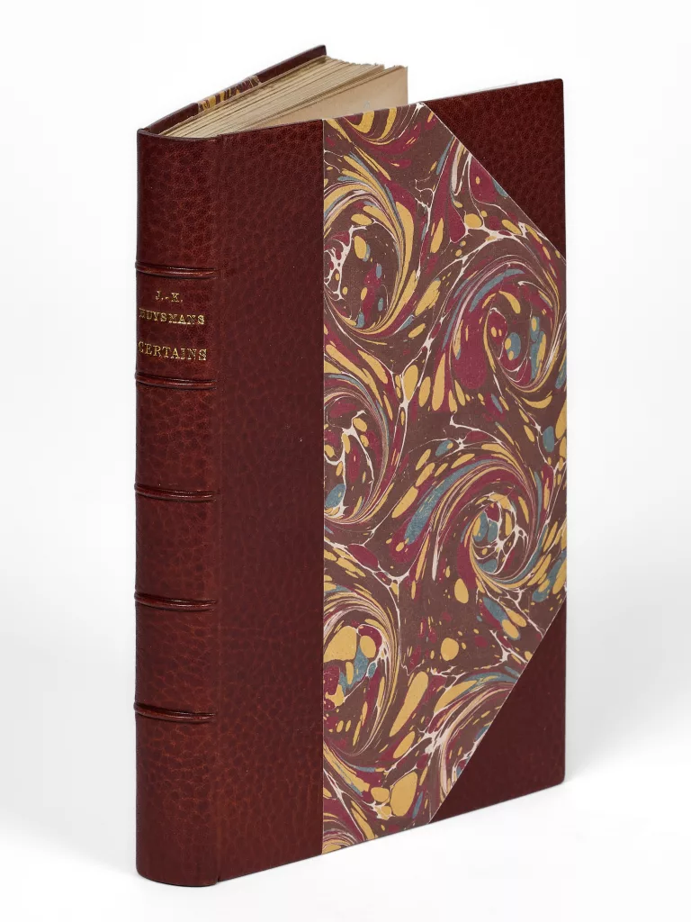 Exemplaire offert à son ami d’enfance Jules Bobin, bibliophile, et exécuteur testamentaire de Huysmans. « [Il] avait parmi ses amis un grand bibliophile, Jules Bobin, qui avait réuni une collection immense de livres anciens et rares. Parmi ces livres, nombreux étaient ceux concernant l’occultisme, la liturgie, les curiosités religieuses, sujets chers à Huysmans qui dut souvent fouiller dans les rayons de son ami » (Bulletin de la société J.-K. Huysmans, mars 1929). Surnommé « Le Professeur » par ses familiers, Huysmans lui dédia « La Rue de la Chine », parmi ses Croquis parisiens (1880).
