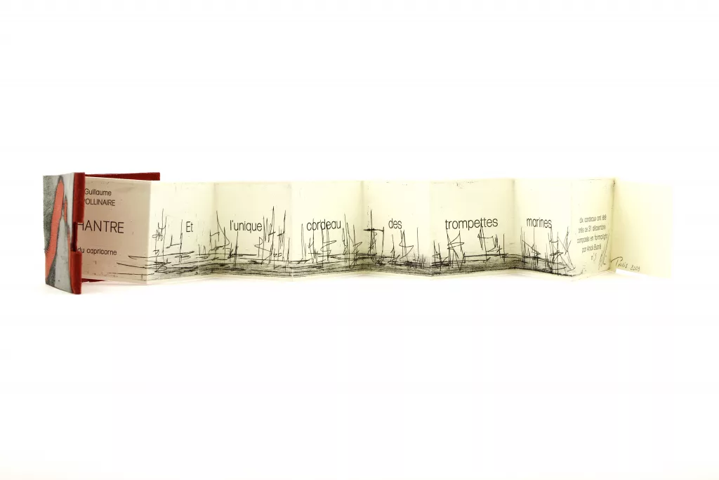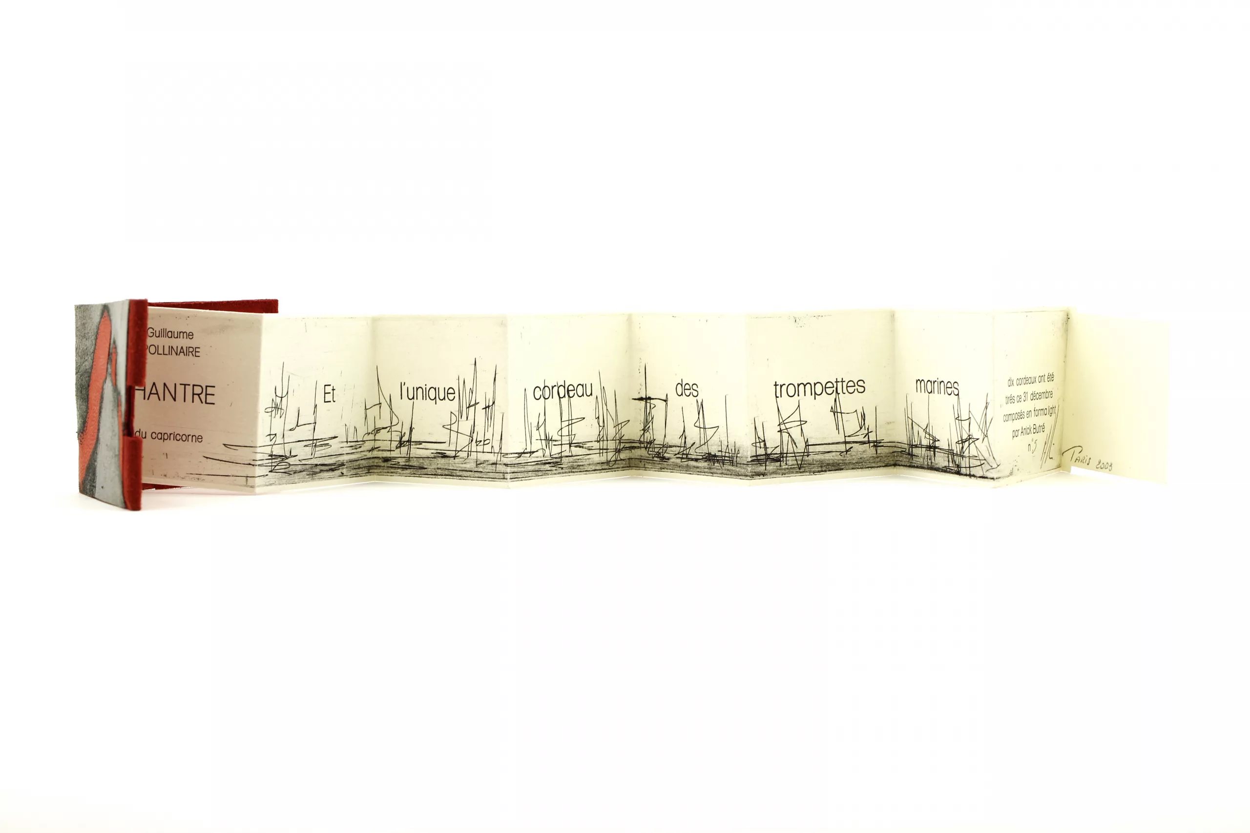 Très belle réalisation graphique pour le fameux Chantre d’Apollinaire. Ce poème, apparu dans Alcools en 1913, se compose d’un unique vers, censé concentrer toutes les musicalités sonores de la langue : « et l’unique cordeau des trompettes marines ».
