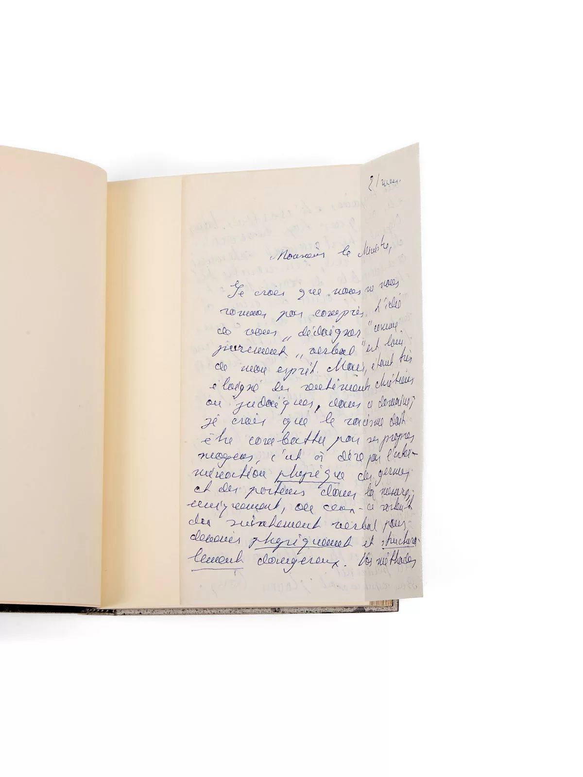 Montée en tête : lettre autographe signée à un « Ministre » [Jules Moch], datée du 21 mai [1970], en deux pages en 1 f. (135 x 210 mm), stylo bille bleu.