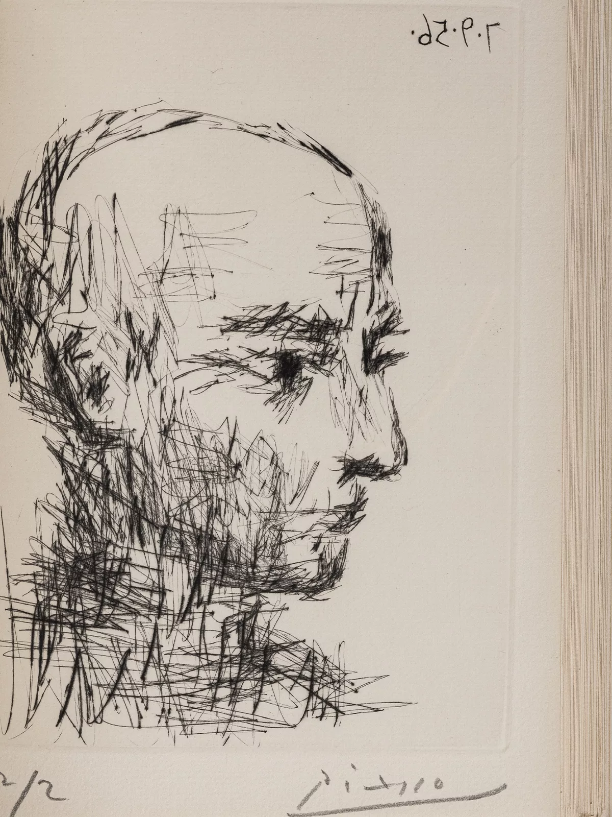 – les 3 pointes-sèches sur vergé de Montval, exceptionnellement signées par l’artiste. On ne connaît aucune autre suite de ces trois pointes-sèches signée, hormis celles des épreuves Broder qui comportent la mention autographe du peintre au crayon : « Bon à tirer / Picasso / Cannes le 10.9.56 » (Aguttes, septembre 2021, n° 442). La suite présente dans les 30 exemplaires du tirage de tête n’est signée dans aucun des exemplaires connus ;