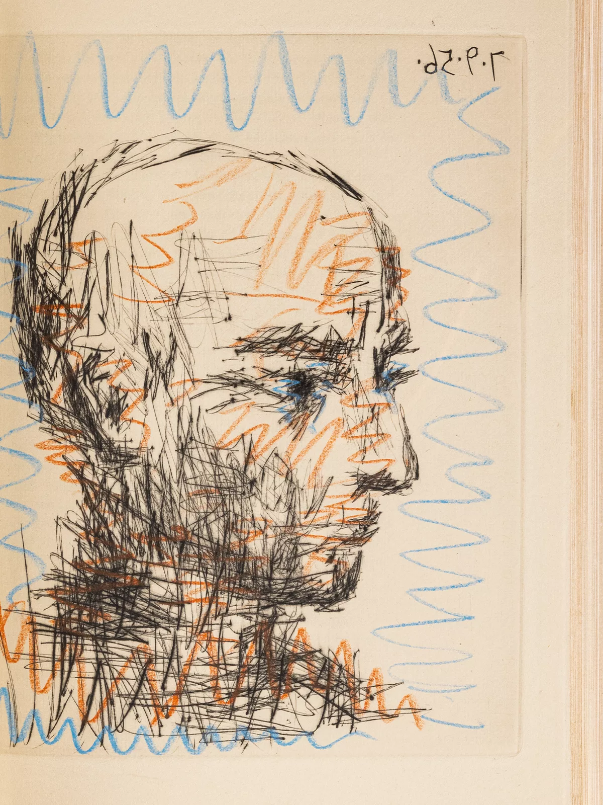 – le portrait frontispice lithographié, sur japon, ici rehaussé à la main et en couleurs par Picasso ;