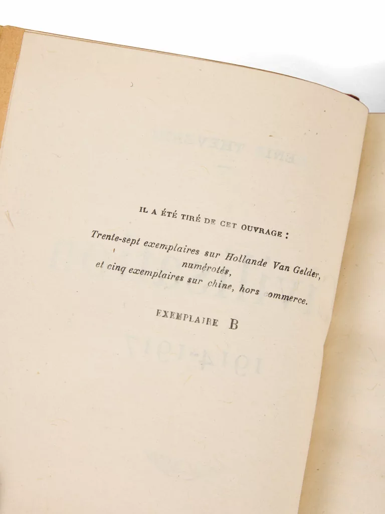 Le présent exemplaire fait partie du rarissime tirage sur chine, limité à cinq hors commerce. Une coquille typographique semble spécifique à ce tirage : la date imprimée au faux-titre donne 1916, ce qui laisse supposer une composition antérieure au tirage commercial, évidemment corrigé à la bonne date de 1918 – le reste de l’impression étant par ailleurs strictement identique.