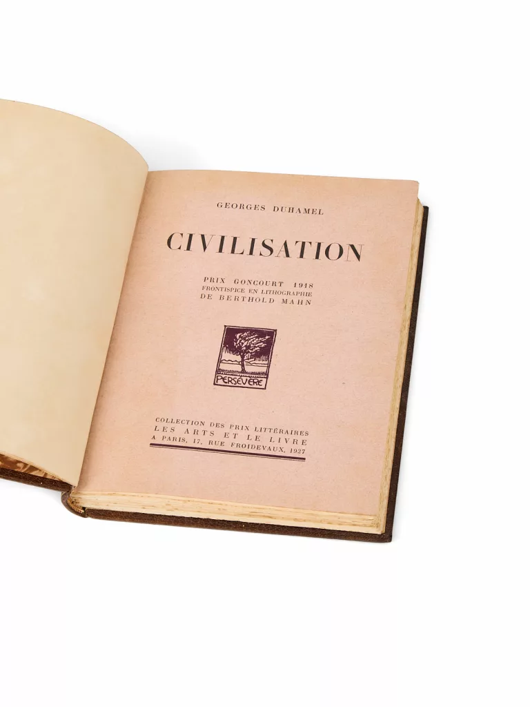 Ce dernier, à la suite d’un grave accident de voiture en 1925, avait revendu les parts de sa maison d’édition pour prendre la direction, en 1926, d’une plus petite structure : la maison d’édition Les Arts et Le Livre, reprise à son beau-frère, Henri Jonquières. Il y créera plusieurs séries, dont cette collection. Ce tirage, bien que modeste, marque l’entrée de Civilisation dans une édition de bibliothèque illustrée, à destination d’un lectorat plus large. La présence d’un exemplaire dans la bibliothèque de Maurice Genevoix souligne une fois encore l’intérêt constant qu’il porta aux récits de guerre publiés par ses contemporains.