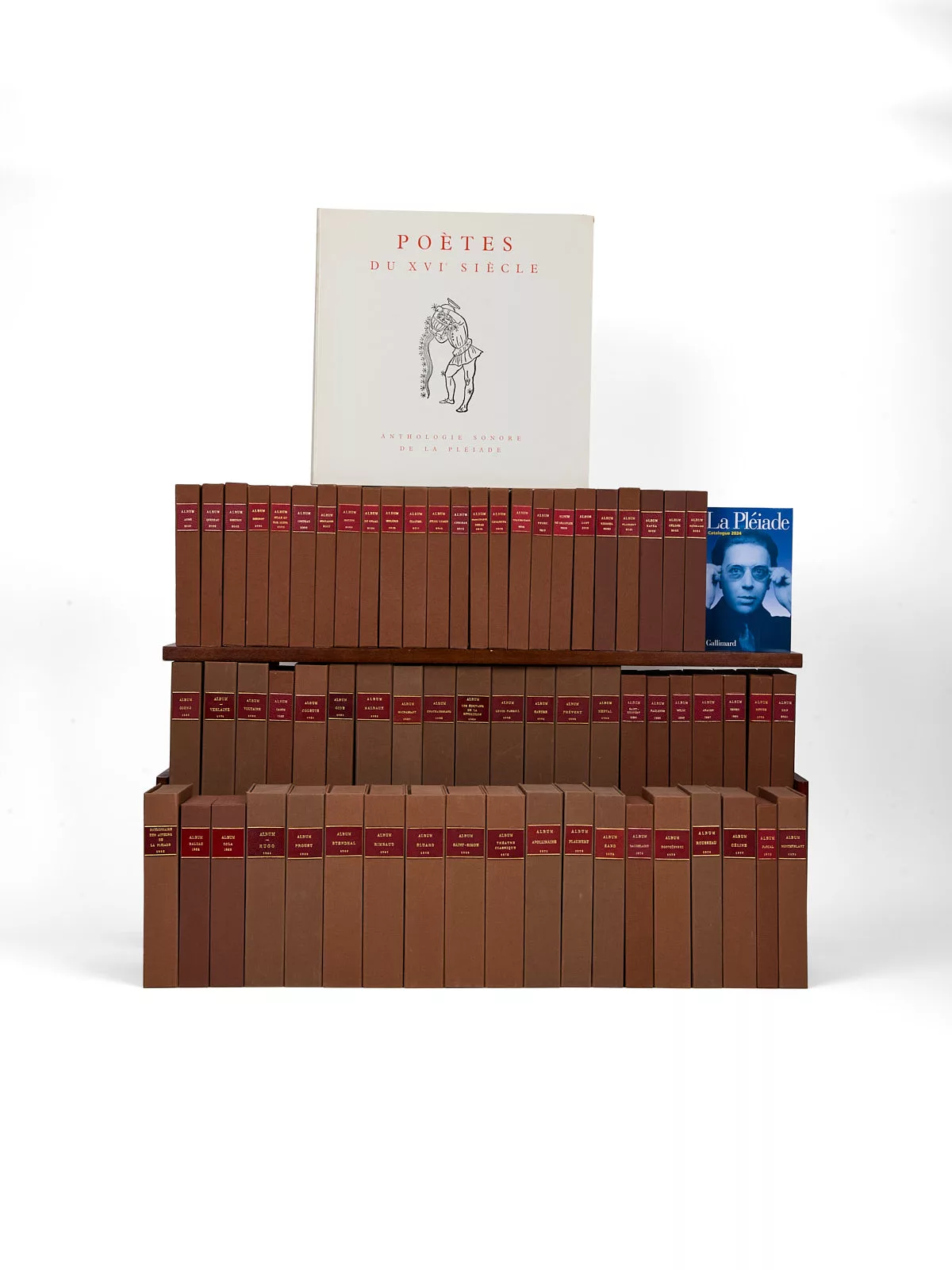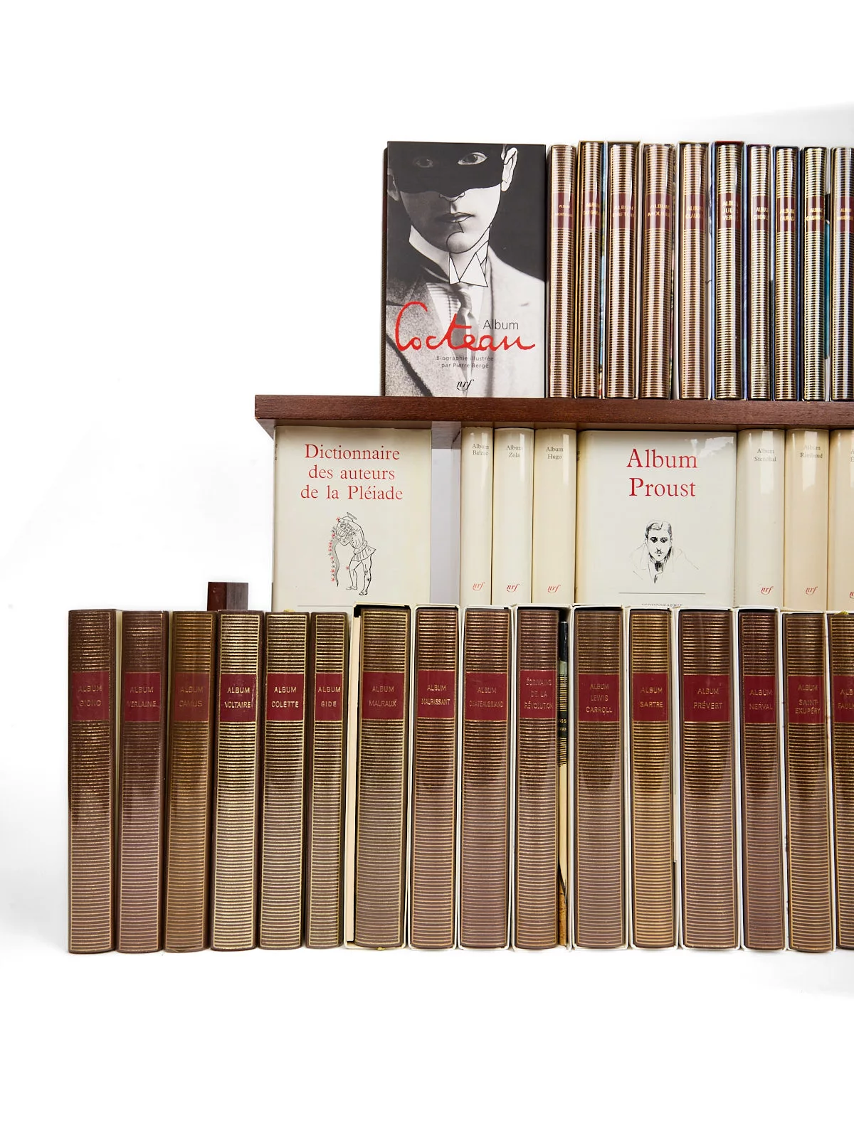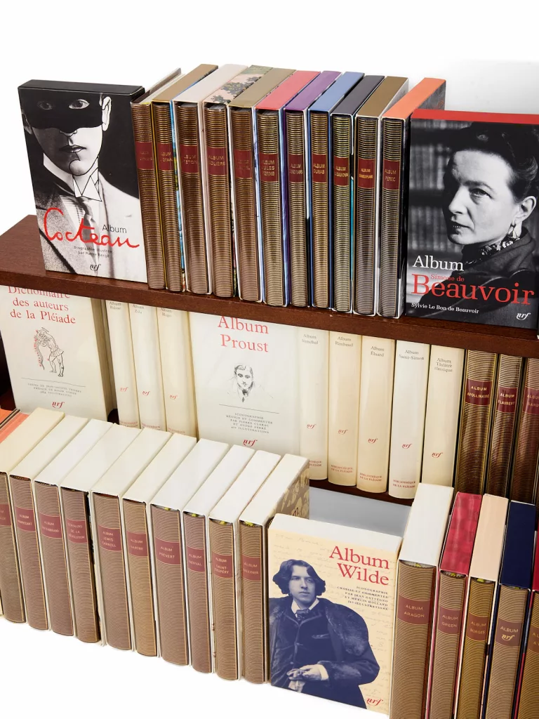 Nés dans le sillage de la « Quinzaine de la Pléiade » (mise en place en 1958), les Albums constituent la contrepartie hors commerce offerte par les libraires aux fidèles acheteurs de trois volumes de la Bibliothèque de la Pléiade : tirés en une fois (env. 40 000 ex.), ni réimprimés ni réédités, ils forment une série biographique et iconographique de référence, abondamment illustrée (in-texte en noir à l’origine, cahiers couleurs dès 1992, puis tout en couleurs), au même format que les volumes de la Pléiade. En reliure cuir, dos or, pièce de titre rouge, papier plus fort pour la qualité d’impression. La protection a évolué, le rhodoïd et étui cartonné jusqu’en 1985 (avec l’exception du Verlaine en étui rhodoïd fragile) a été remplécé par un rhodoïd avec étui blanc imprimé, puis un étui en couleurs depuis 1994 ; les demi jaquettes apparaissent en 1971 pour laisser apparaître la reliure. Préfigurés par le Dictionnaire des auteurs de la Pléiade (1960) et l’Anthologie sonore en 1961, les Albums commencèrent véritablement en 1962 et ne sont jamais consacrés à des auteurs vivants ; ils offrent, au-delà du récit bio-bibliographique, une iconographie souvent inédite.