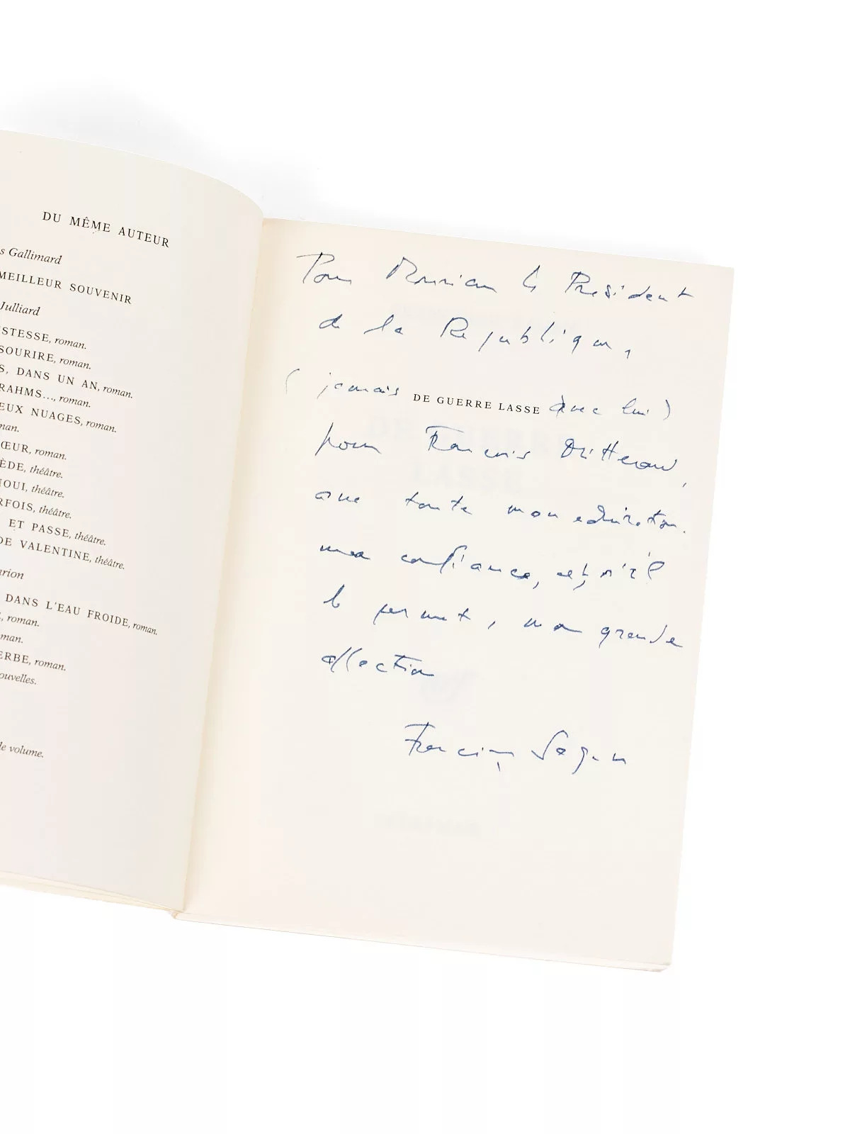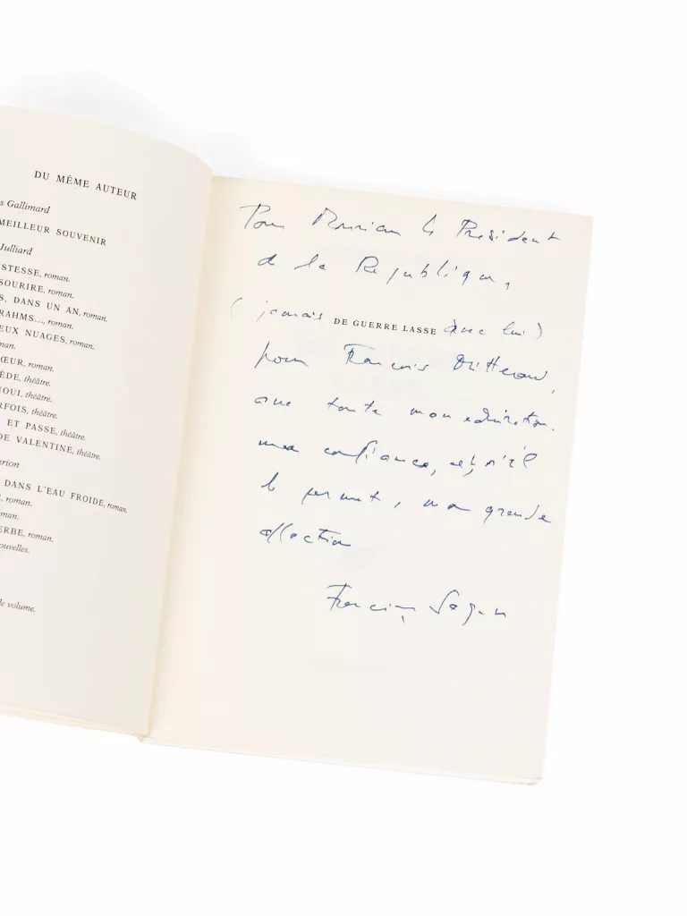 Envoi signé : « Pour Monsieur le Président de la République, (jamais [de guerre lasse] avec lui) pour François Mitterrand, avec toute mon admiration, ma confiance, et, s'il le permet, ma grande affection Françoise Sagan ».