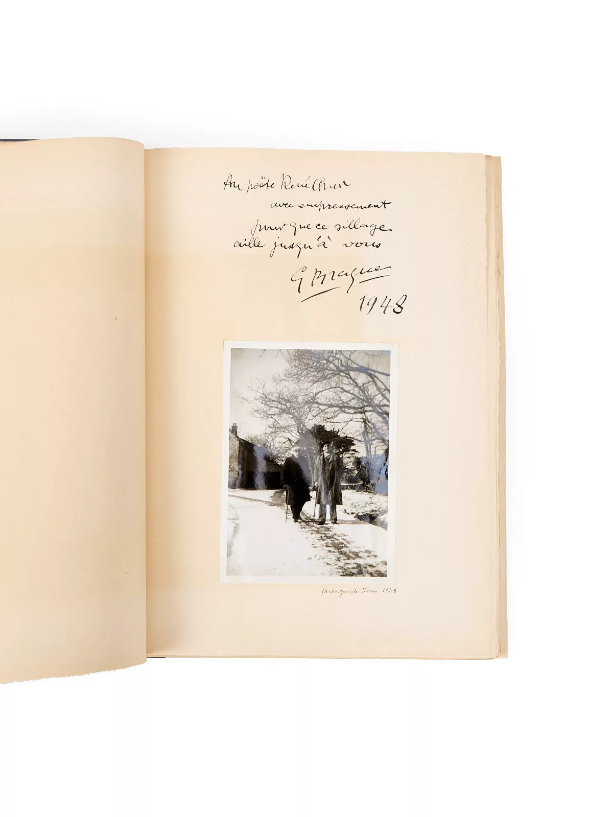 L'exemplaire de René Char, justifié à la main, enrichi d'une photographie contrecollée et légendée par Char : « Varengeville Février 1948 ».