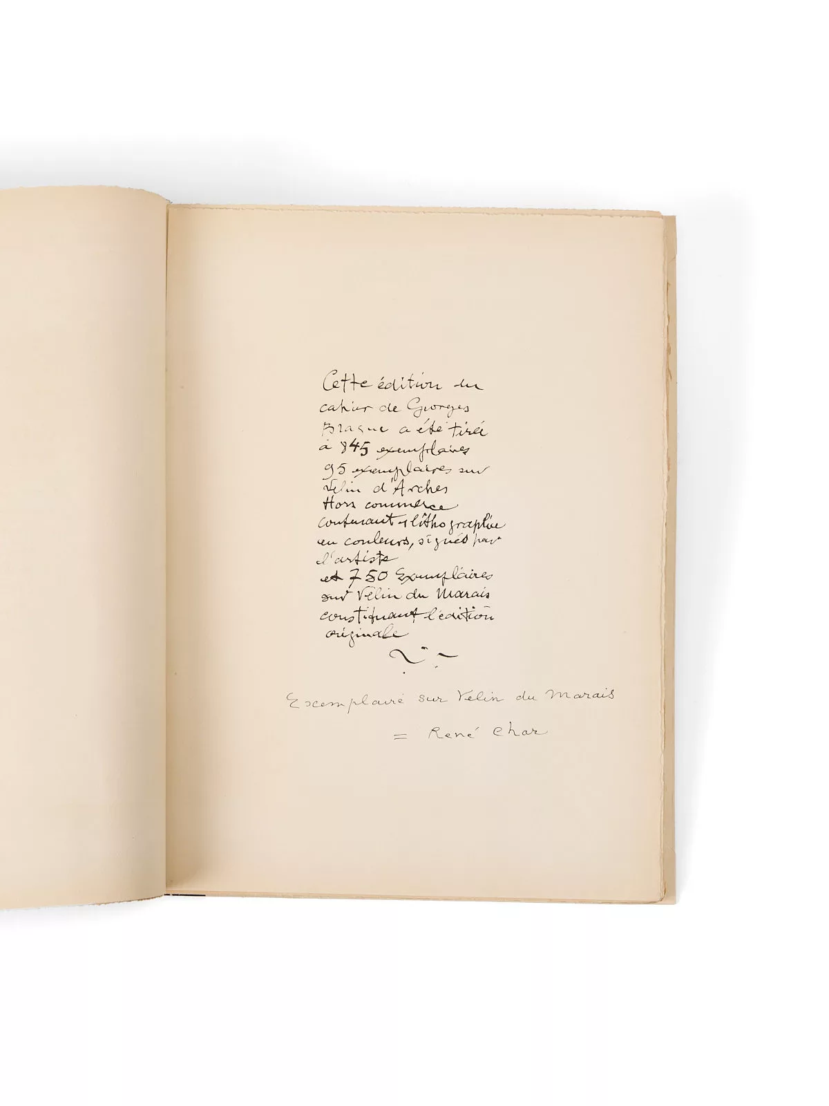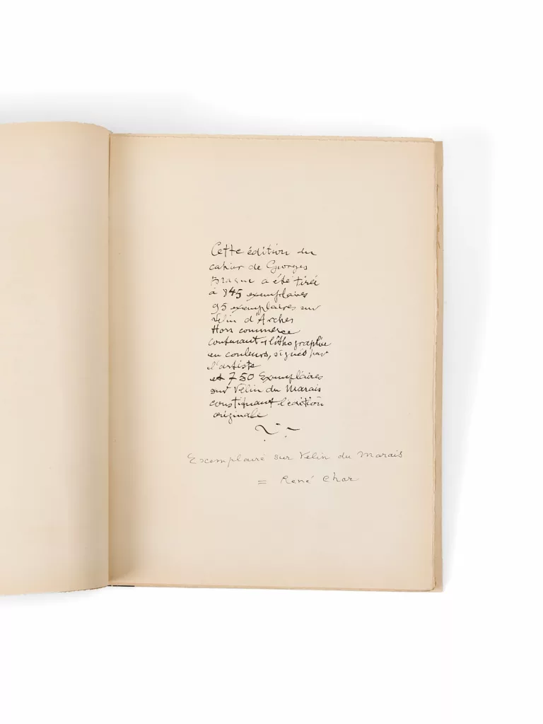 Il s’agit du premier cahier consacré à Georges Braque, un an après sa rencontre avec Aimé Maeght, son futur marchand. Braque avait rencontré Char en 1947 et aussitôt accepté de donner en mai un texte pour le premier numéro de Derrière le miroir consacré à l’artiste, pour la première exposition de Braque chez Maeght à Paris (Derrière le miroir, Georges Braque, n° 4, juin 1947). Après l’exposition, Maeght publie le Cahier de Georges Braque, 1917-1947, aboutissement de ses réflexions sur l’art. Char et Braque se rencontrent pour la première fois en septembre en marge du premier festival d’Avignon créé par Jean Vilar l’aide de Char, à l’exposition d’art moderne organisée par Yvonne Zervos. La complicité des deux hommes est immédiate. Braque séjourne dès l’automne aux Busclats, chez Char, que le peintre invite à Varengeville-sur-mer, dans la maison normande qu’il possède avec son épouse Marcelle.