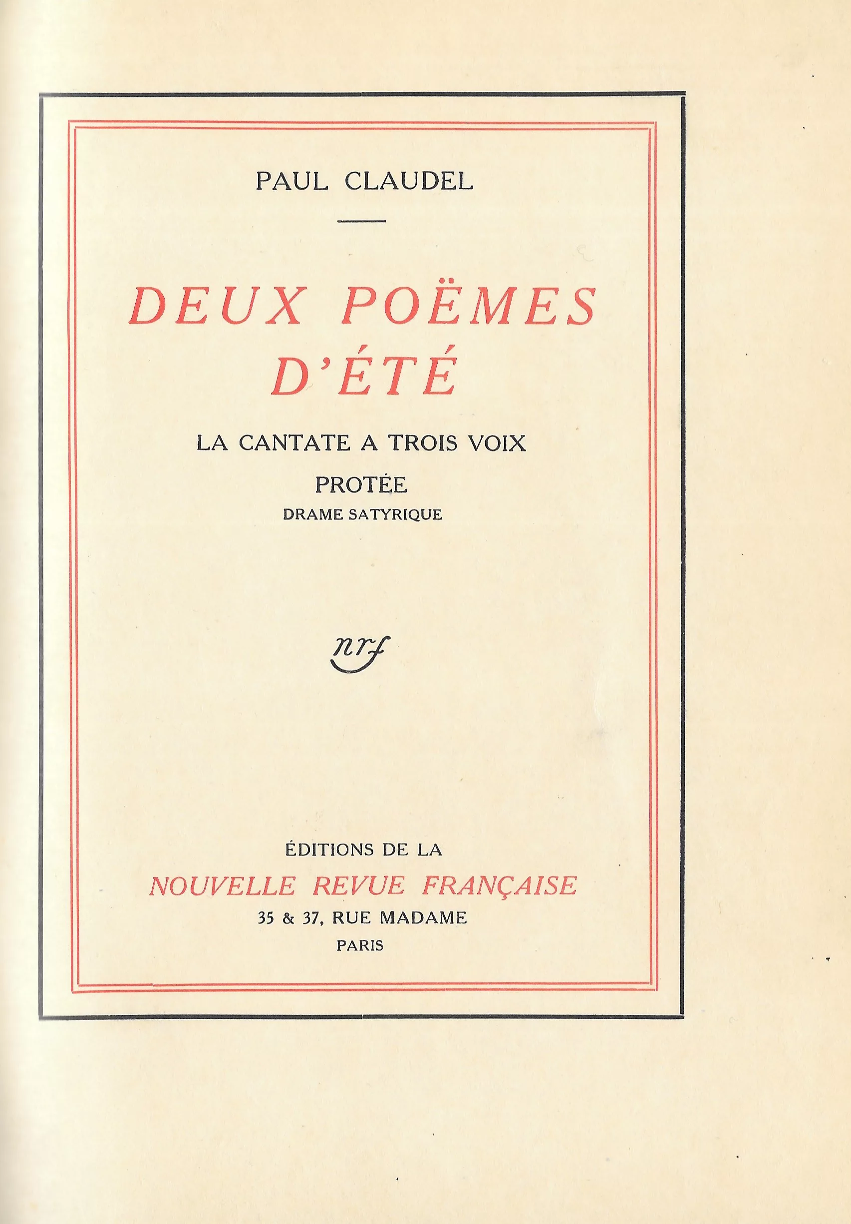 Les exemplaires du tirage courant (2200 exemplaires sur vergé) sont imprimés 6 jours plus tard, le 16 mai 1914 ; la publication de ce cinquième titre aux jeunes Éditions de la Nouvelle Revue Française fait alors de Claudel l’auteur le plus publié depuis la création du « comptoir d’éditions », en 1911.