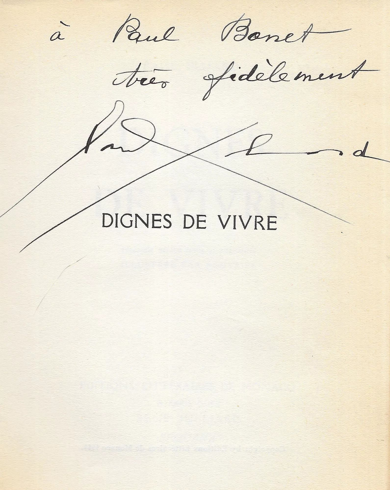 Les courbes de Dignes de vivre sont en revanche du dessin à la plume, qui enchantent Éluard, lequel « se montre émerveillé de mon grand Fautrier – l’homme rougeâtre au ventre ouvert ». Reprenant la deuxième édition de Poésie et Vérité 1942, Eluard l’augmente de quelques poèmes, lui ôte le poème « L’Âne » et lui donne un nouveau titre, Digne de vivre. Ce recueil est donc un réajustement et une amplification de Poésie et Vérité 1942, d’où son sous-titre « Édition nouvelle, revue et augmentée ».