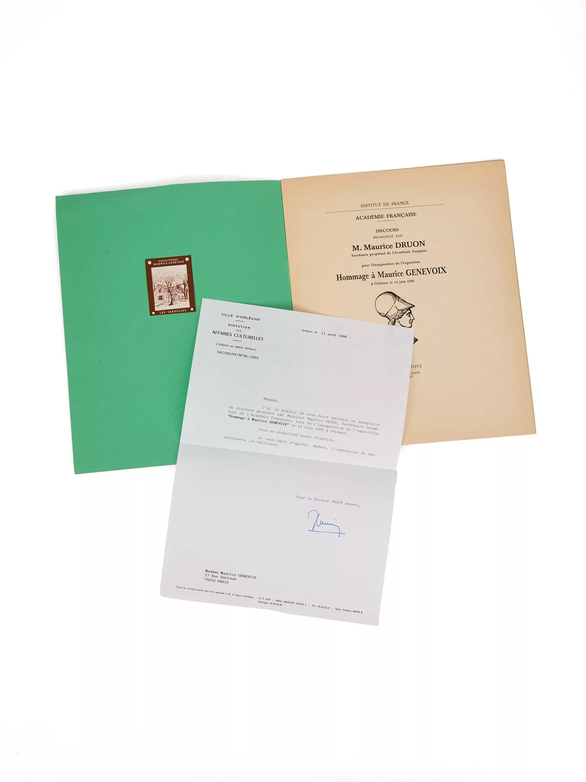 Une lettre dactylographiée sur papier à en-tête de la ville d’Orléans (direction des Affaires culturelles), datée du 11 août 1986, signée pour le Dr Guy Penot, adjoint au maire délégué à la Culture. Elle est adressée à Madame Genevoix, veuve de l’écrivain, pour accompagner l’envoi du discours prononcé par Druon.