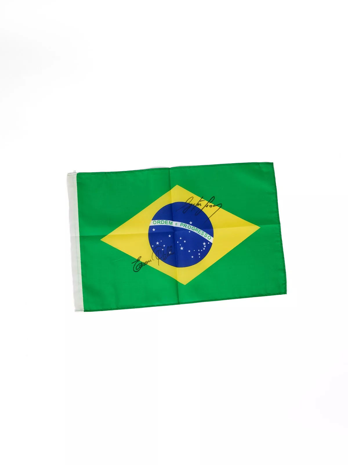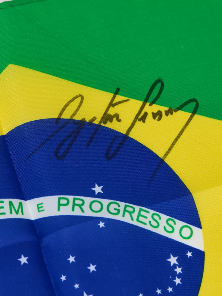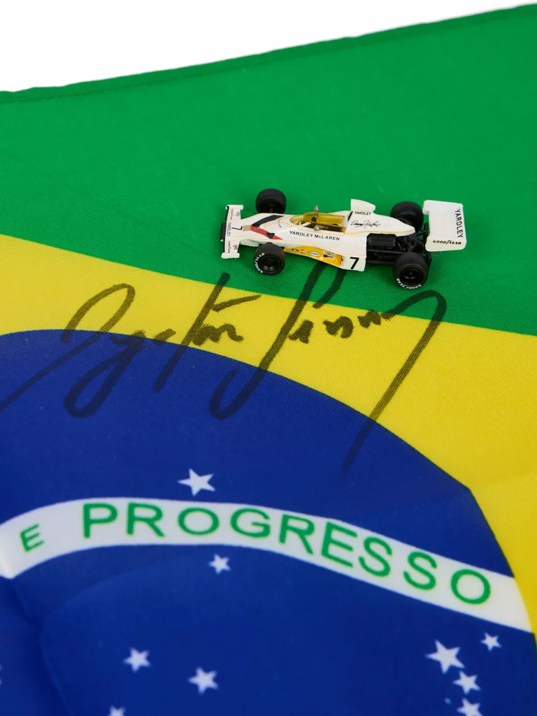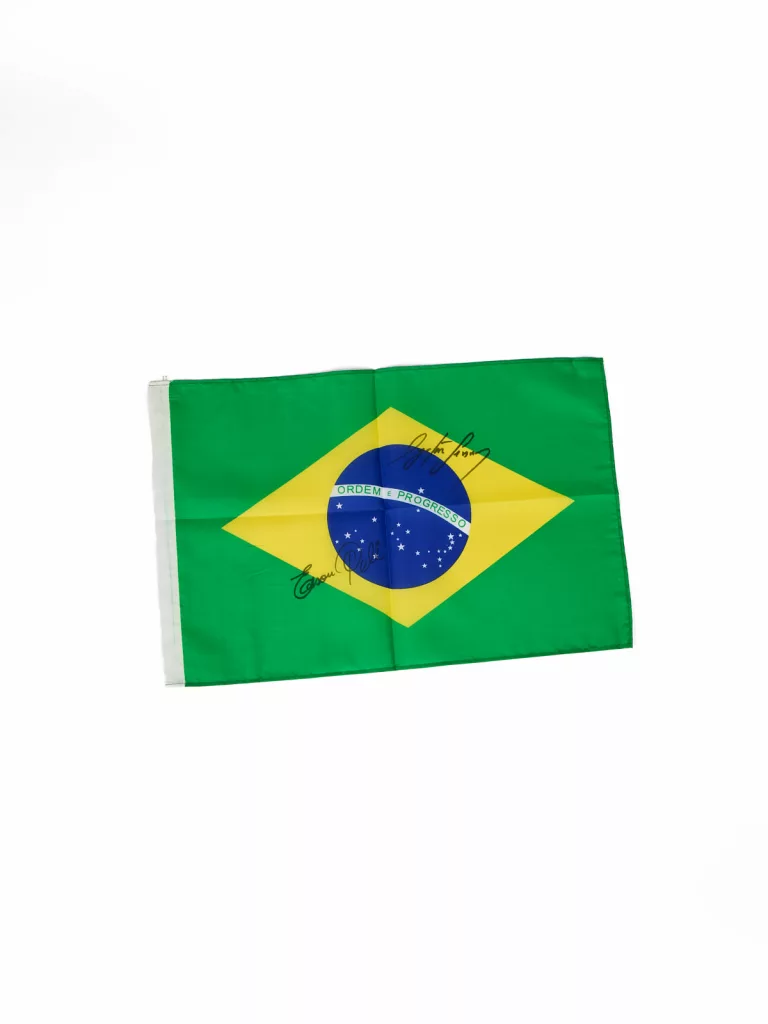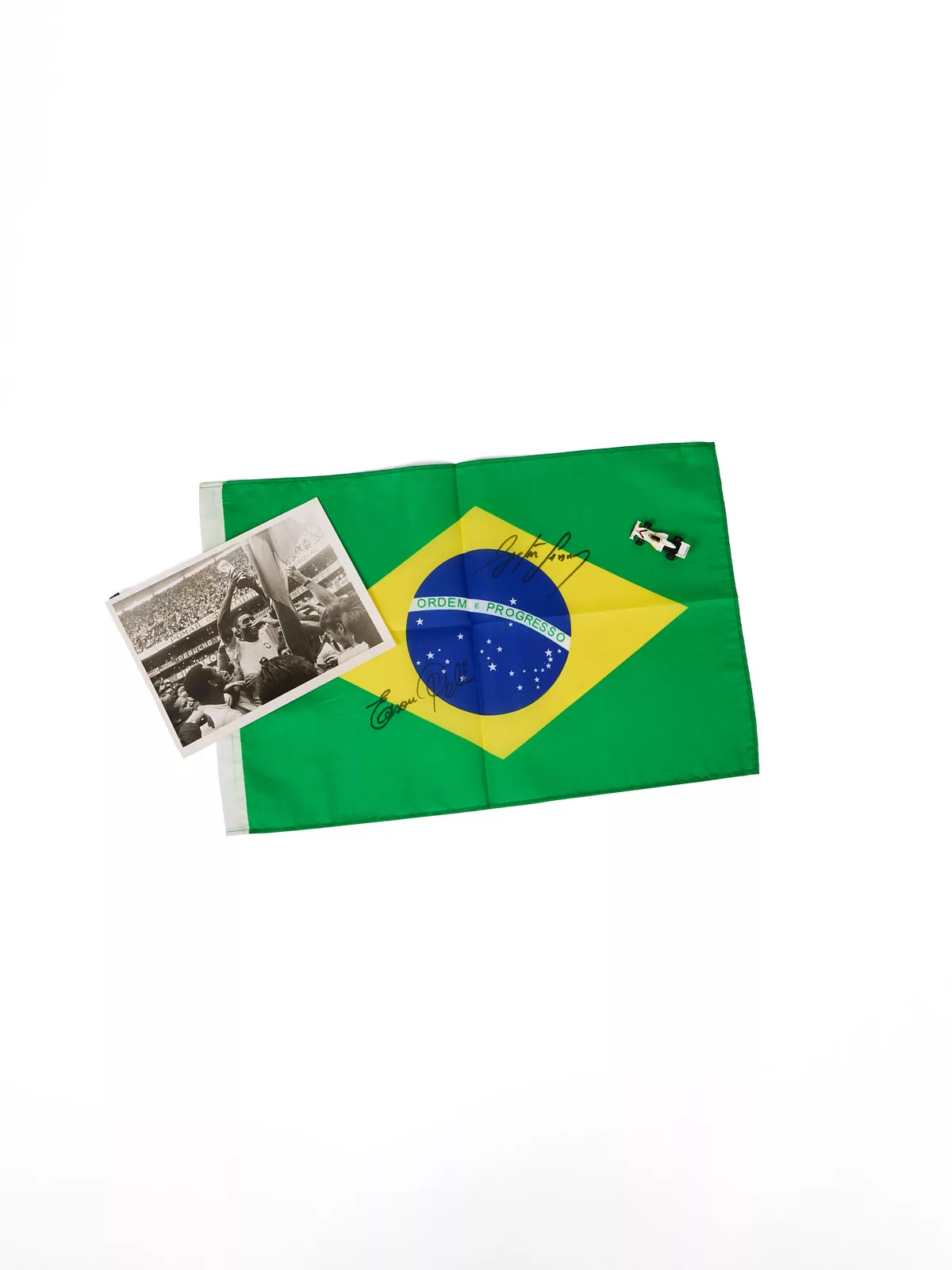 Le drapeau fut, selon son précédent propriétaire brésilien, dédicacé par les deux hommes lors d’une soirée fêtant la victoire d’Ayrton Senna au Grand Prix d’Interlagos, à São Paulo, au Grand Prix du Brésil 1993, au volant de sa McLaren-Ford. Il y devance Damon Hill et Michael Schumacher. La soirée était organisée par le constructeur McLaren, qui fête à cette occasion sa 100e victoire en Grand Prix. C’est la 37e pour Senna, longtemps à la bagarre avec Alain Prost, parti en pole-position, qui abandonne sur accident au 30e tour.