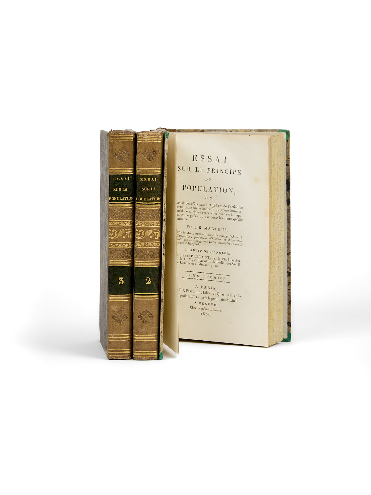 Deux ans après cette parution, l’Essai fait l’objet d’une traduction partielle par le Suisse Pierre Prévost, qui fut professeur de physique et de philosophie à l’Université de Genève. Certains chapitres sont intégralement traduits, tandis que d’autres ne le sont que partiellement. Prévost accompagne sa traduction de notes et commentaires personnels ; encouragé par Malthus, il fait paraître en 1809 à Paris et à Genève cette nouvelle édition, la première complète, donnée d’après la dernière établie par Malthus en 1807 (la quatrième édition anglaise). « [Malthus] m’a même autorisé en conséquence à y faire les changements que j’estimer[a]is nécessaires. Je n’ai pas abusé de cette permission. Je me suis prescrit au contraire de faire connaître l’ouvrage de M. Malthus, tel qu’il l’a lui-même publié. L’appendice est la seule partie où j’ai fait des retranchements et quelques modifications, sans les indiquer en détail ; parce que les objections que l’auteur y discute m’ont paru quelquefois trop faibles ou trop particulières, pour mériter d’être exposées et réfutées dans une traduction, avec autant d’étendue qu’elles le sont dans l’original. Mais j’ai supprimé certains morceaux et même des chapitres entiers, qui s’écartent un peu du sujet principal ou qui sont trop immédiatement relatifs à l’Angleterre. »