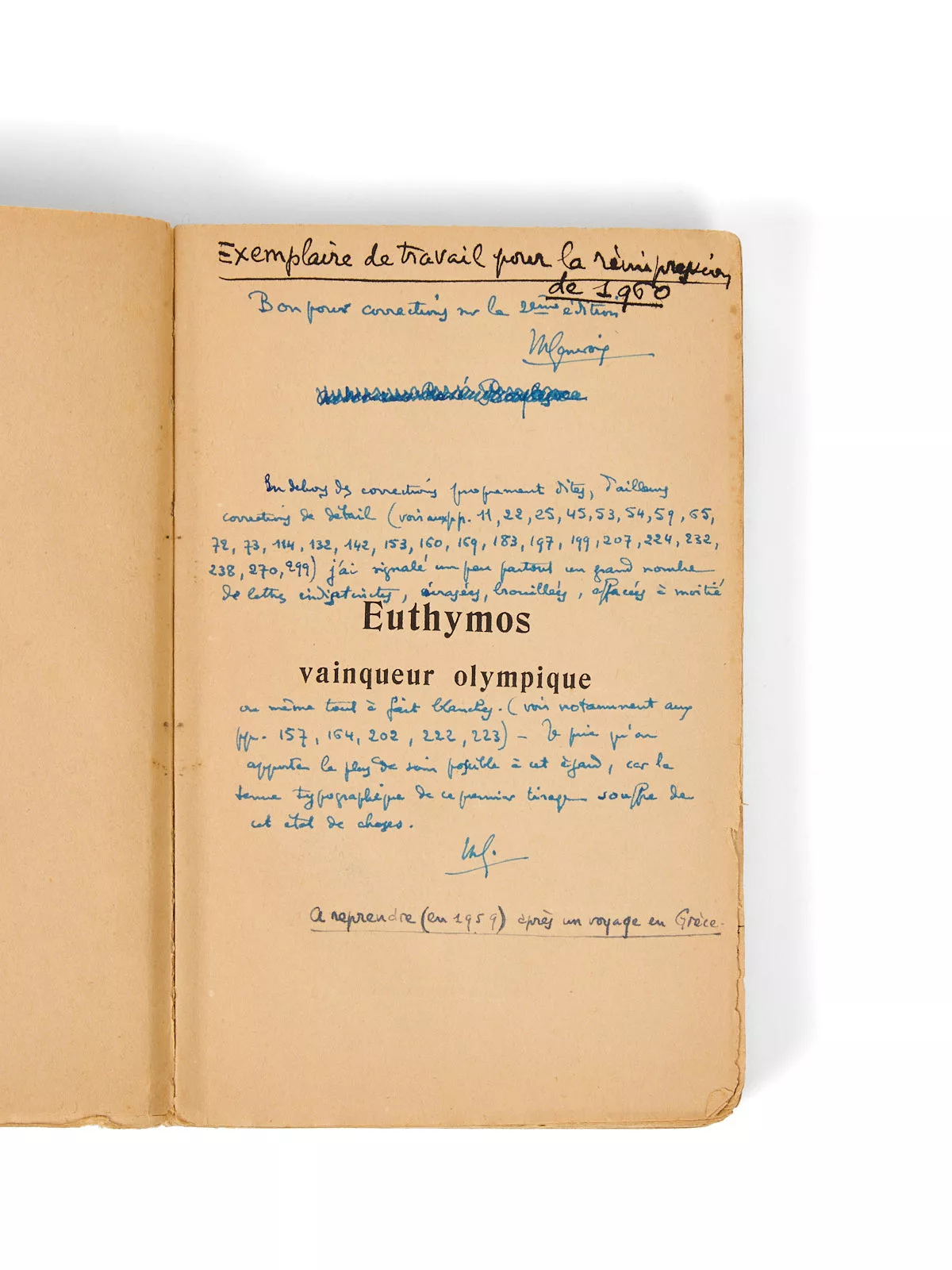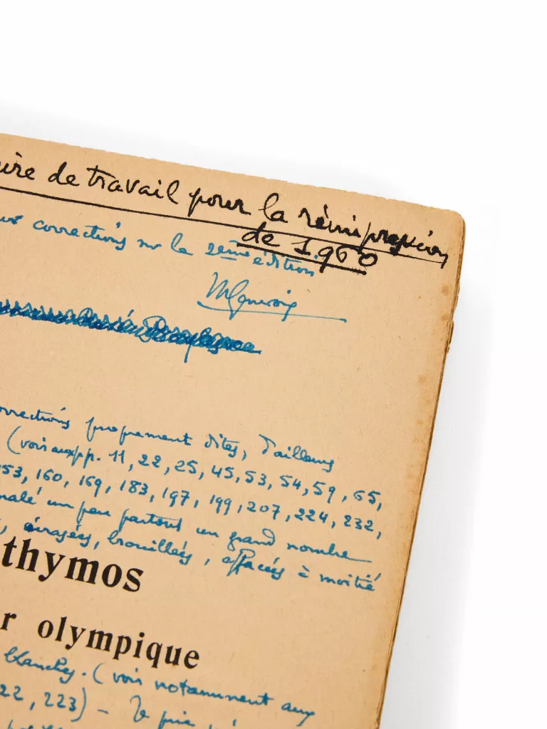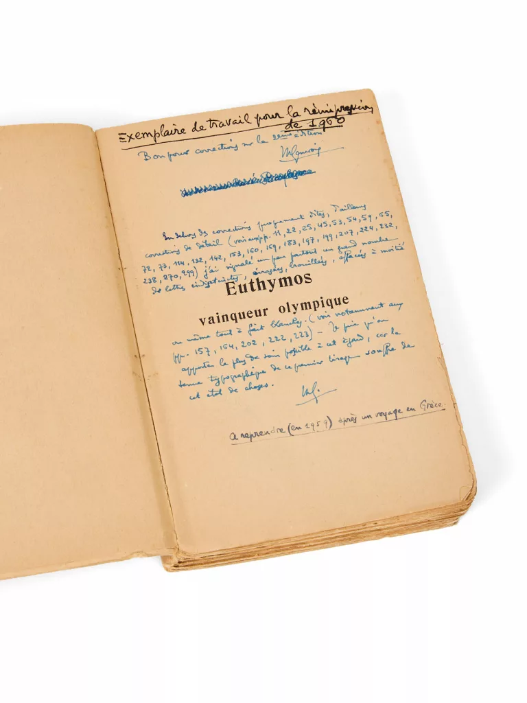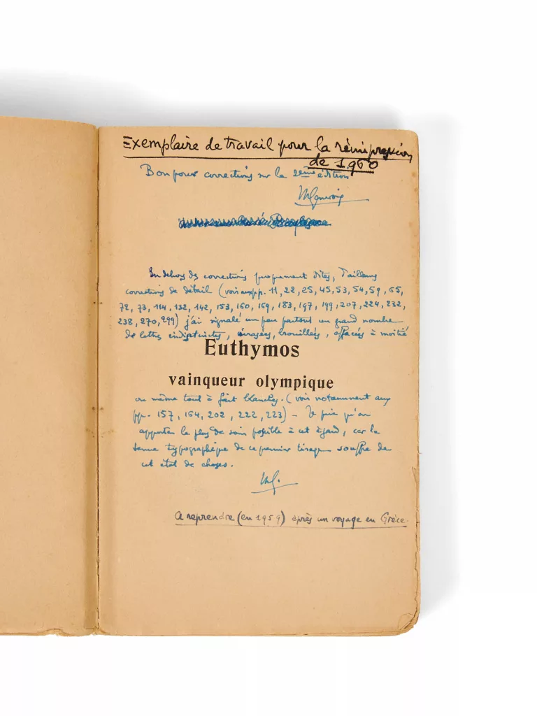 Exemplaire de travail de l’auteur, abondamment corrigé en vue de la réédition de 1960 sous le titre Vaincre à Olympie. Dans les marges, Maurice Genevoix appose une série de notes autographes détaillées, tant sur la forme que sur le fond, destinées à soigner son texte et repérer les défaillances de l’impression initiale.