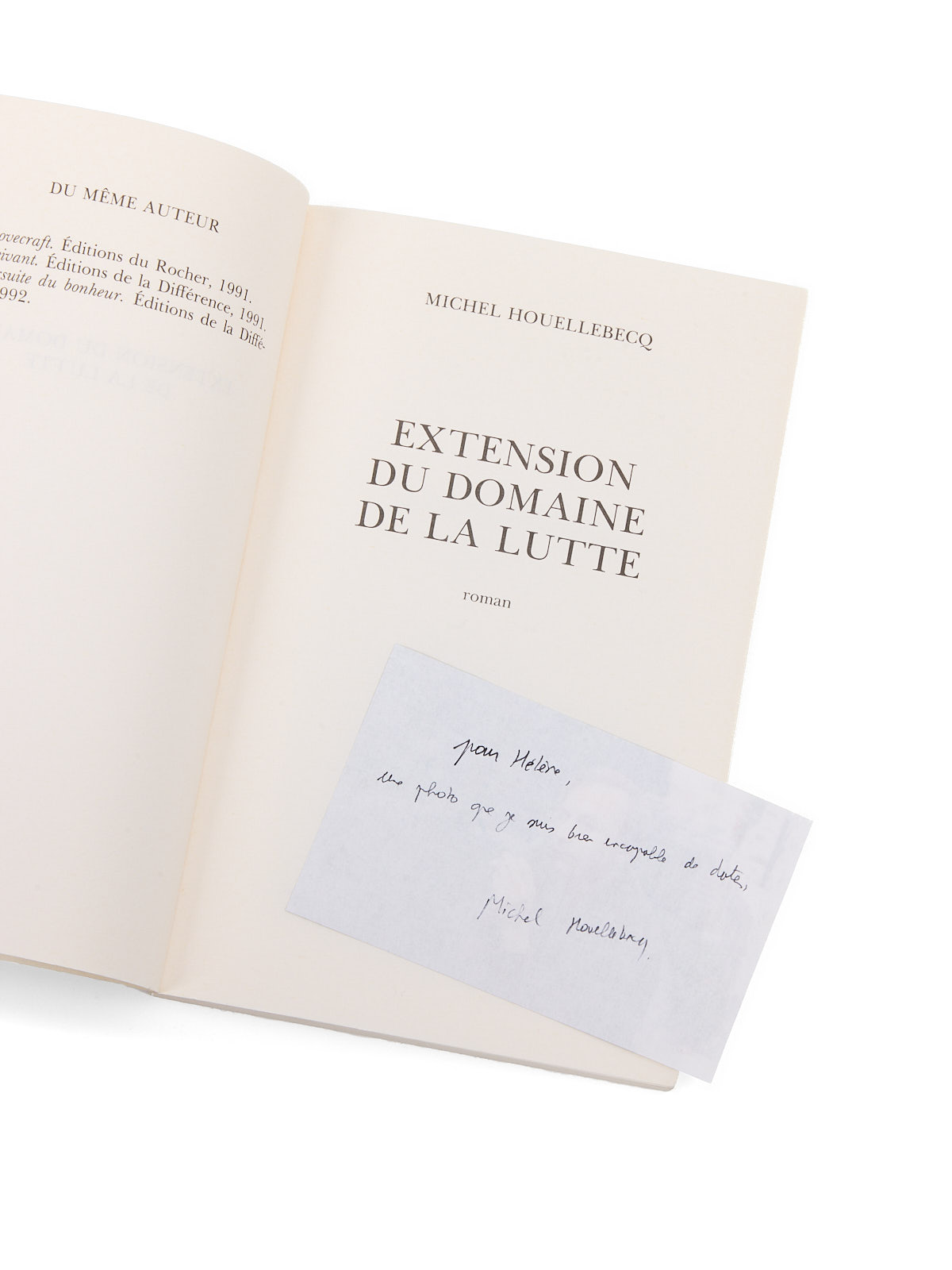 On joint : photographie de Houellebecq jeune - 1 tirage numérique en couleurs (115 x 75 mm) - avec cet envoi autographe : « pour Hélène, une photo que je suis bien incapable de dater, Michel Houellebecq ».