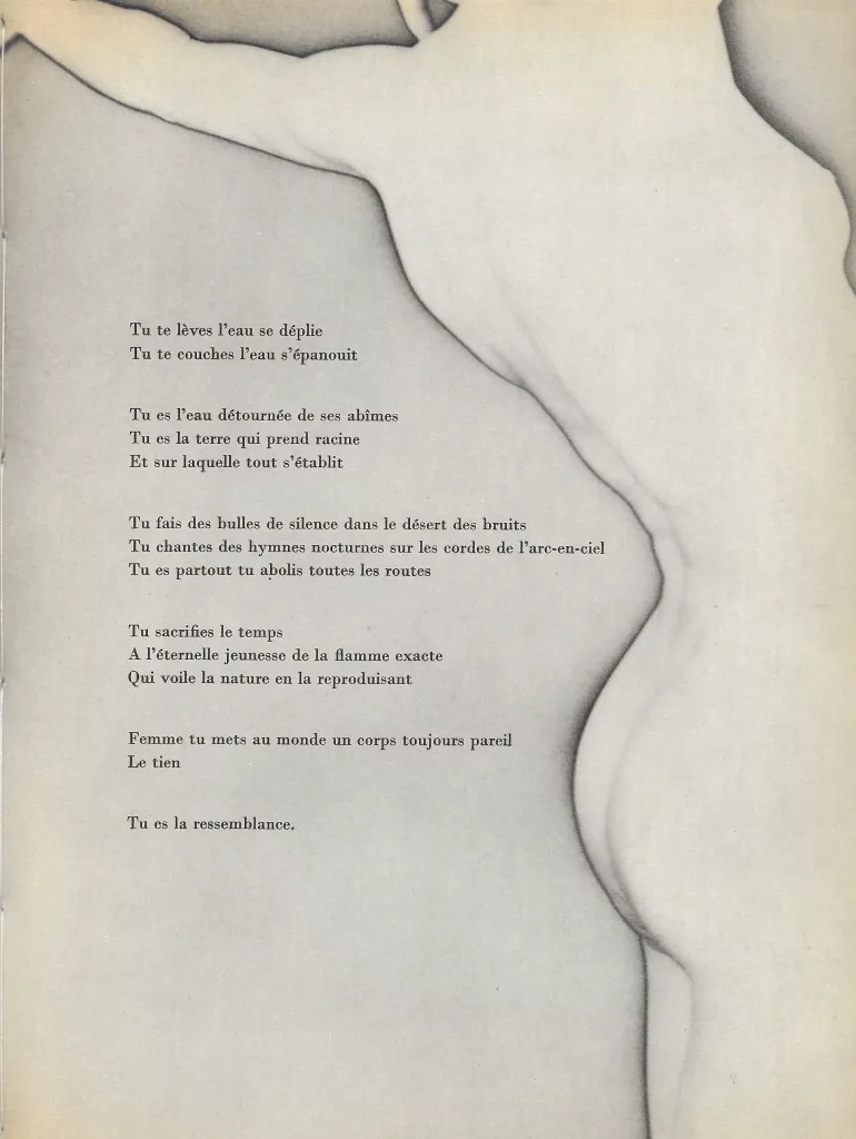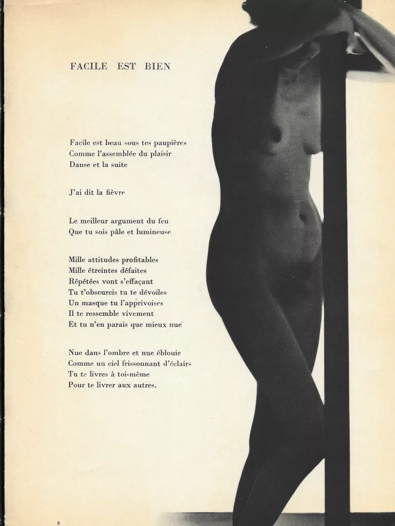 En 1935, Man Ray réalise une série de photos de Nusch, la seconde femme de Paul Éluard, rencontrée en 1929. C’est sur ces images que le poète écrit les poèmes d’amour de Facile, publié dans une mise en pages magistrale par le poète-typographe Guy Levis Mano. Man Ray suivra très attentivement toutes les étapes de la fabrication de ce livre raffiné, un des plus beaux livres surréalistes illustrés par la photographie.