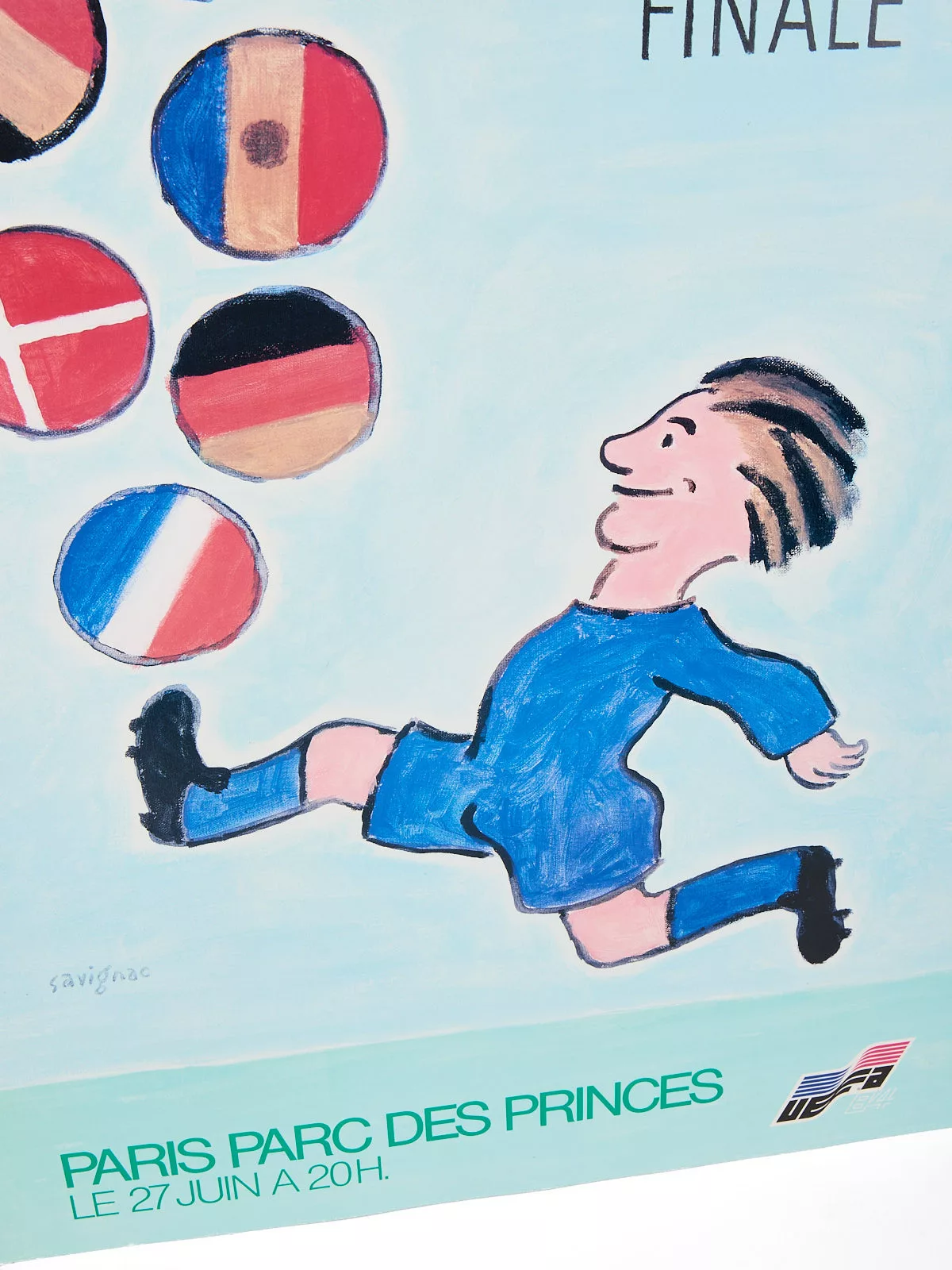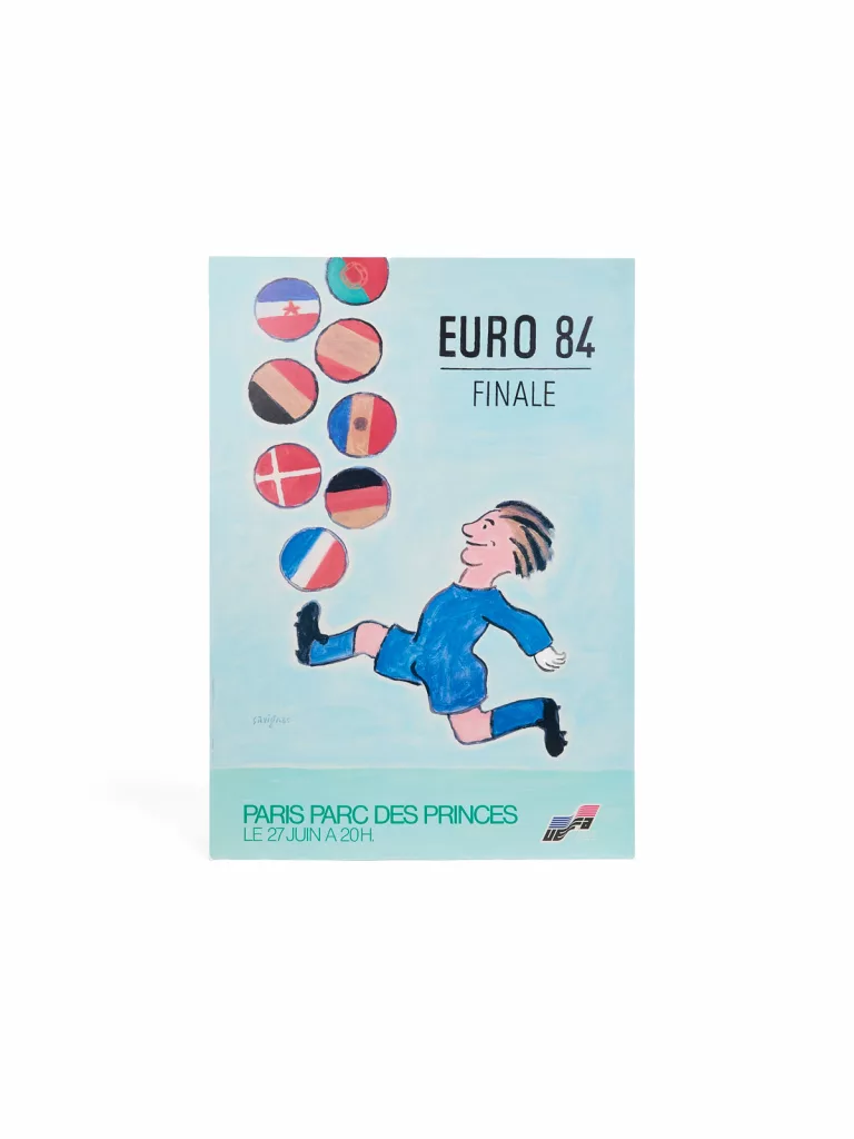 L’Euro 84 se tiendra en France du 12 au 27 juin 1984, sur huit stades (Paris, Lens, Nantes, Lyon, Saint-Etienne, Lyon, Strasbourg et Marseille). Cette affiche est celle réalisée par Raymond Savignac pour la finale de l’Euro 84, le 27 juin 1984.